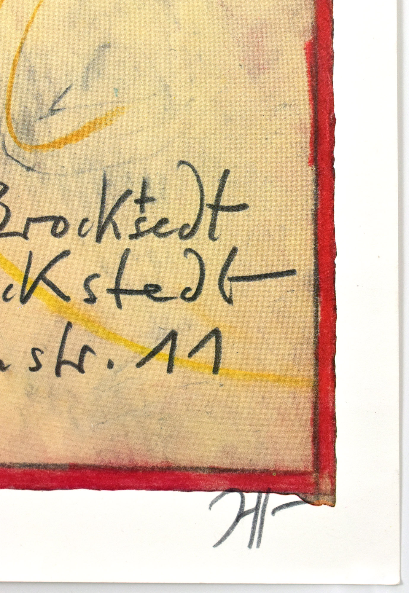 Original-Plakat (Farboffsetdruck) auf weißem Papier. Plakat für die Janssen-Ausstellung (40 Pastelle), in der Galerie Brockstedt, Hamburg September-Oktober 1982. Von Horst Janssen unterhalb der Abbildung in Schwarz signiert. Im Druck beschriftet und datiert. Werkverzeichnis Meyer-Schomann Nr. 135. Maße Blatt: 65 x 35 cm. Eine Ecke wenig bestoßen. Insgesamt sehr gutes Exemplar.