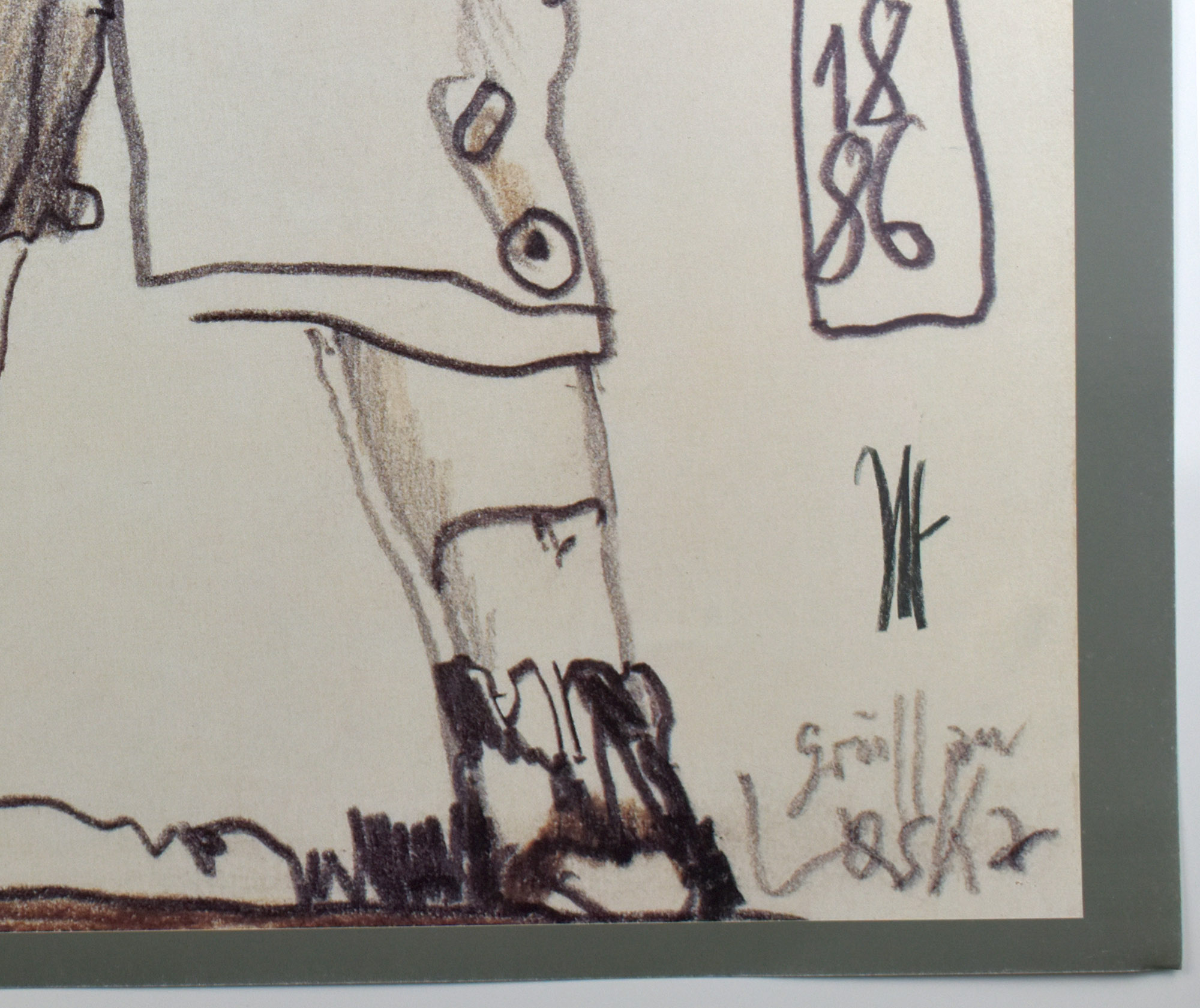 Original-Plakat (Farboffsetdruck) auf weißem Papier. Plakat für die Janssen-Ausstellung in der Galerie F 15 in Bergen, Februar-März 1990. Von Horst Janssen unterhalb der Abbildung in Blei signiert. Nicht im Werkverzeichnis Meyer-Schomann. Maße Blatt: 70 x 50 cm. Sehr gutes Exemplar.