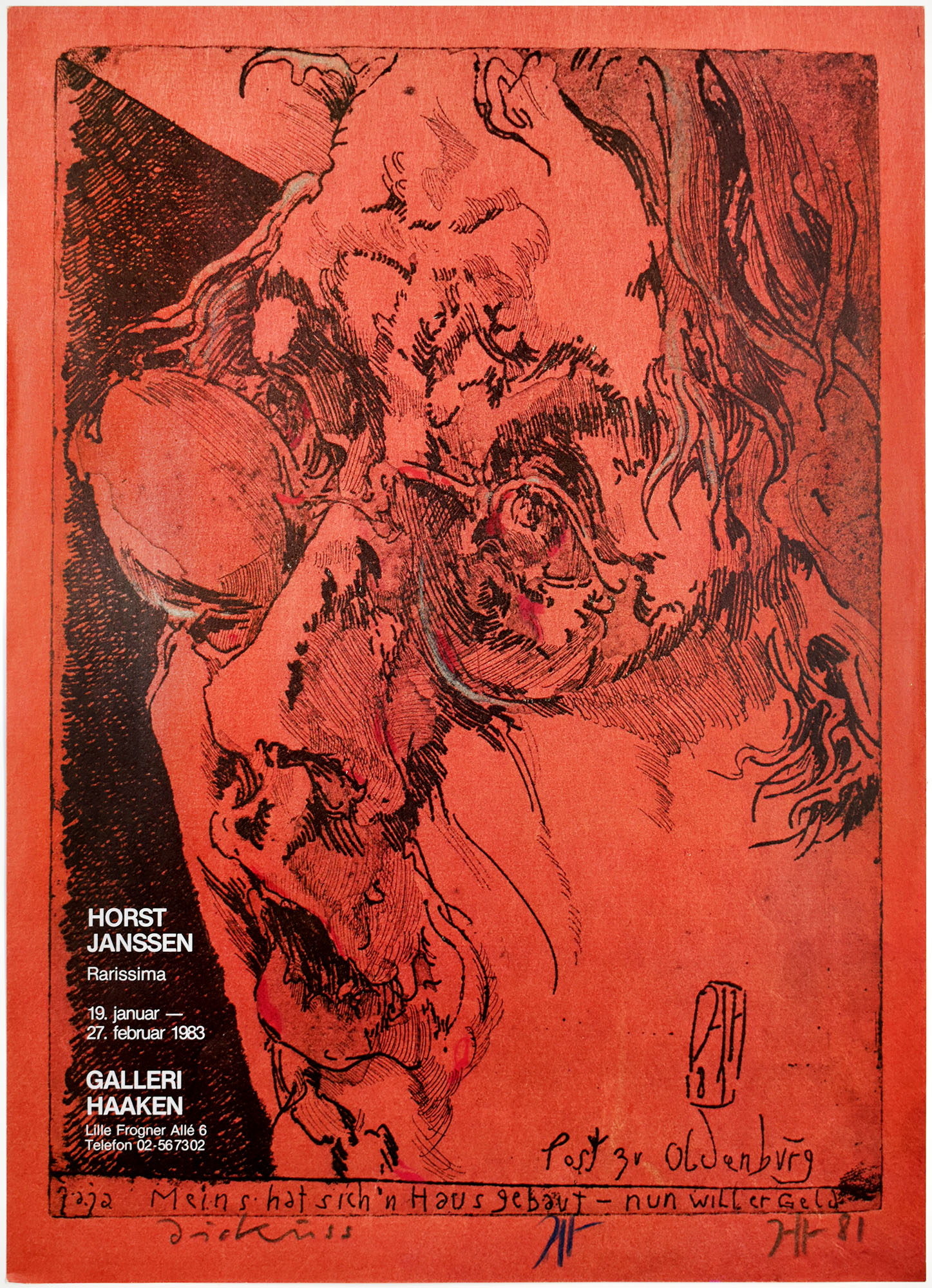 Original-Plakat (Farboffsetdruck) auf weißem Papier. Plakat zur Hanssen-Ausstellung in der Galerie Hakan, Lille, Januar-Februar 1983. Von Horst Janssen unterhalb der Abbildung in Blau signiert. Nicht im Werkverzeichnis Meyer-Schomann. Maße Blatt: 62,5 x 44 cm. Rückseitig wenig fleckig. Noch sehr gutes Exemplar.