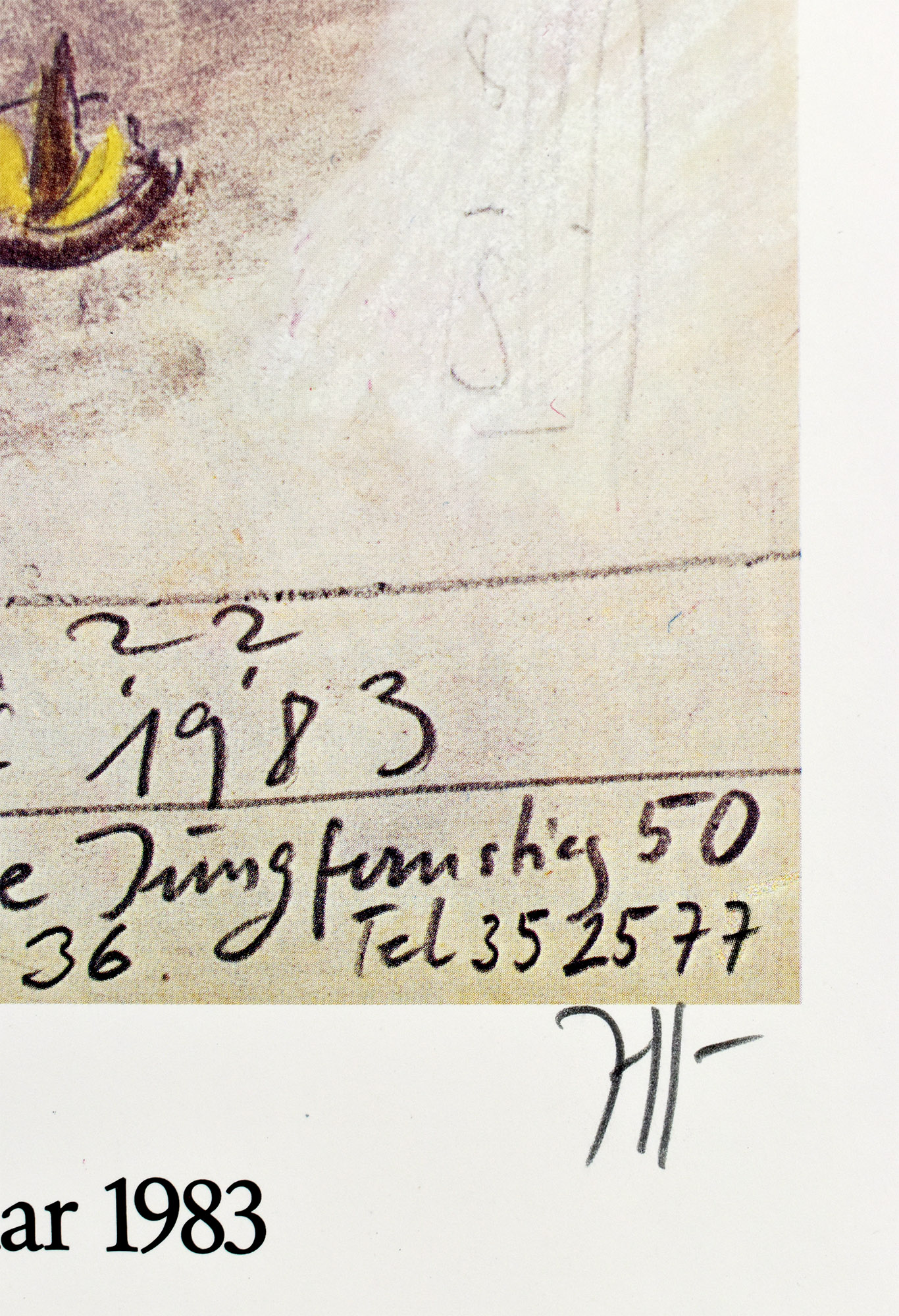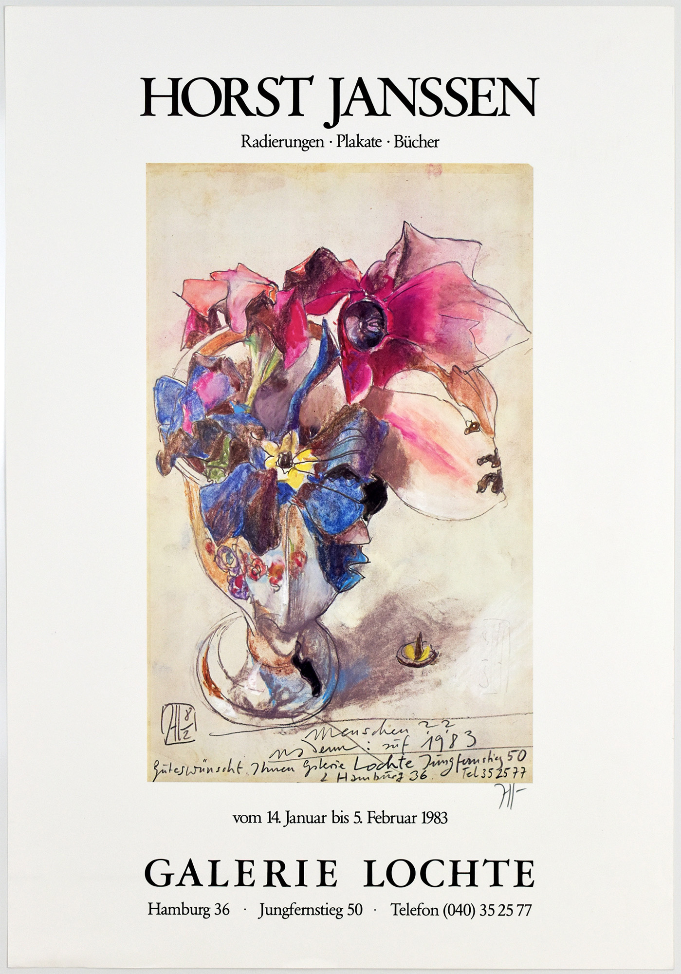 Original-Plakat (Farboffsetdruck) auf weißem Papier. Plakat für die Ausstellung in der Galerie Lochte, Hamburg Januar – Februar 1983. Von Horst Janssen unterhalb der Abbildung in Blei signiert. Nicht im Werkverzeichnis Meyer-Schomann. Maße Blatt: 62 x 43 cm. Sehr gutes Exemplar.