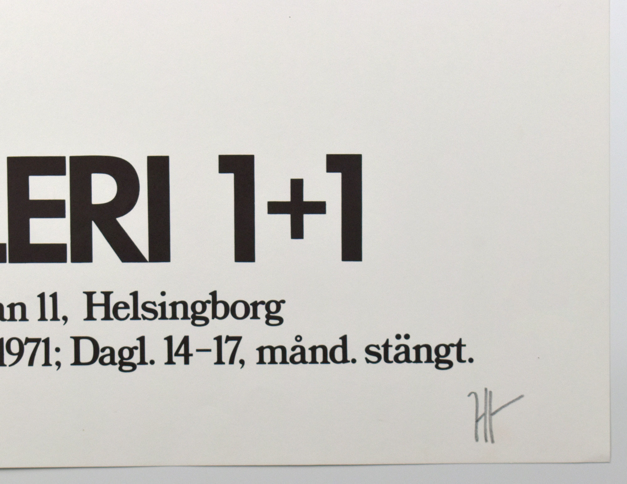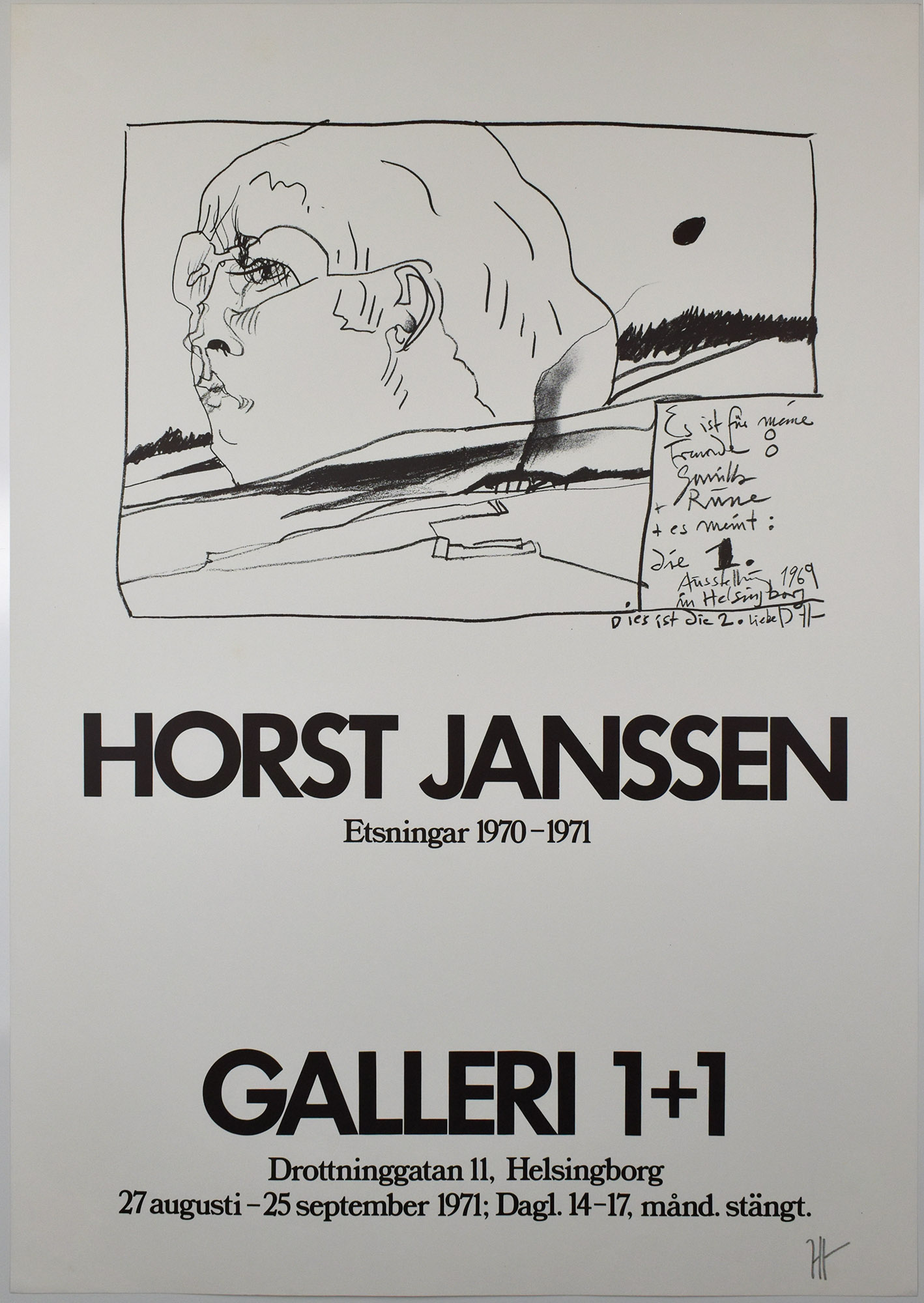 Original-Plakat (Offsetdruck) auf weißem Papier. Plakat zur Janssen-Ausstellung in der Galeri 1+1, Helsingborg (Schweden), August – September 1971. Unterhalb der Abbildung von Horst Janssen in Blei signiert. Nicht im Werkverzeichnis Meyer-Schomann. Maße Blatt: 59,5 x 42 cm. Sehr gutes Exemplar.
