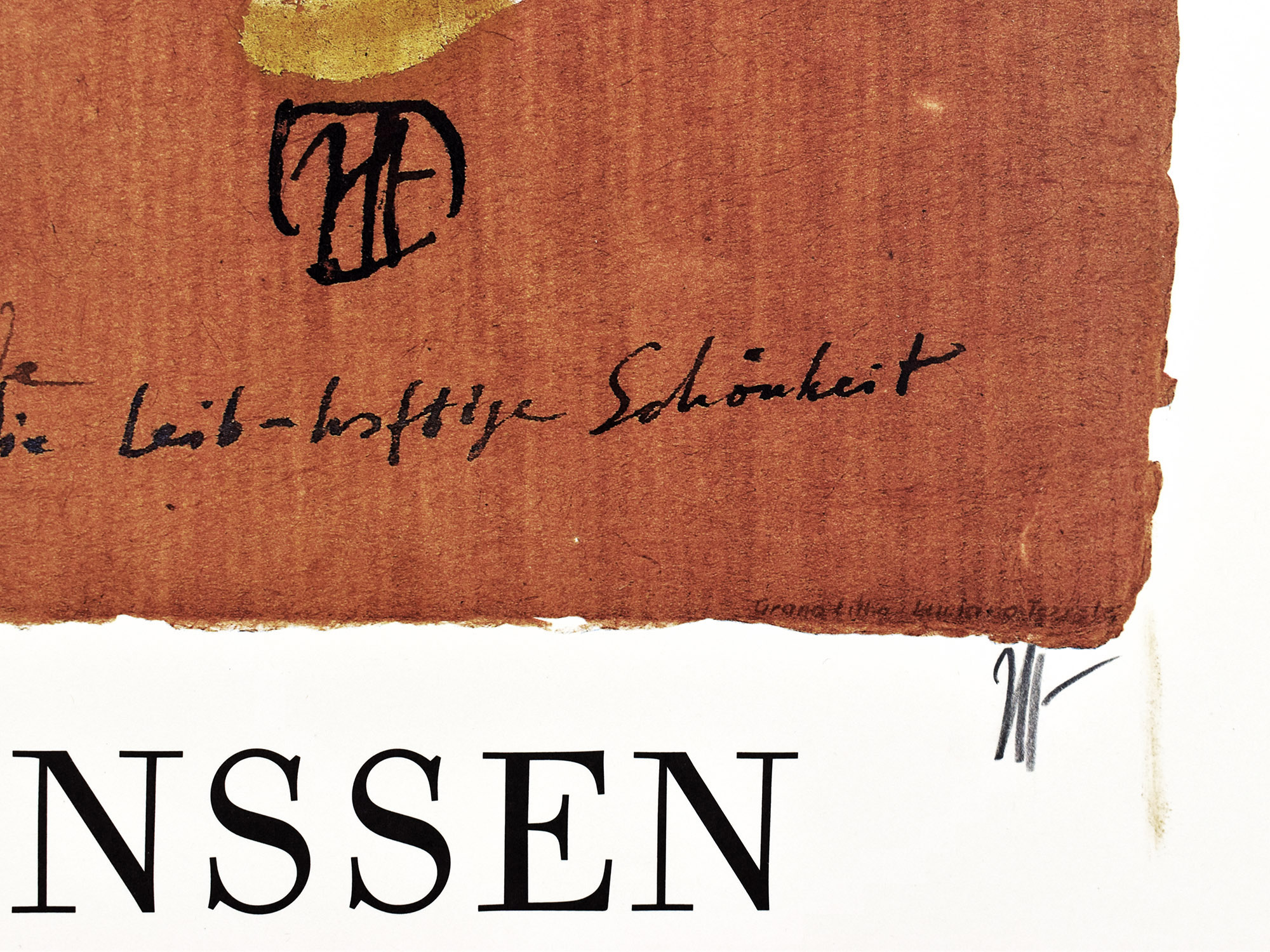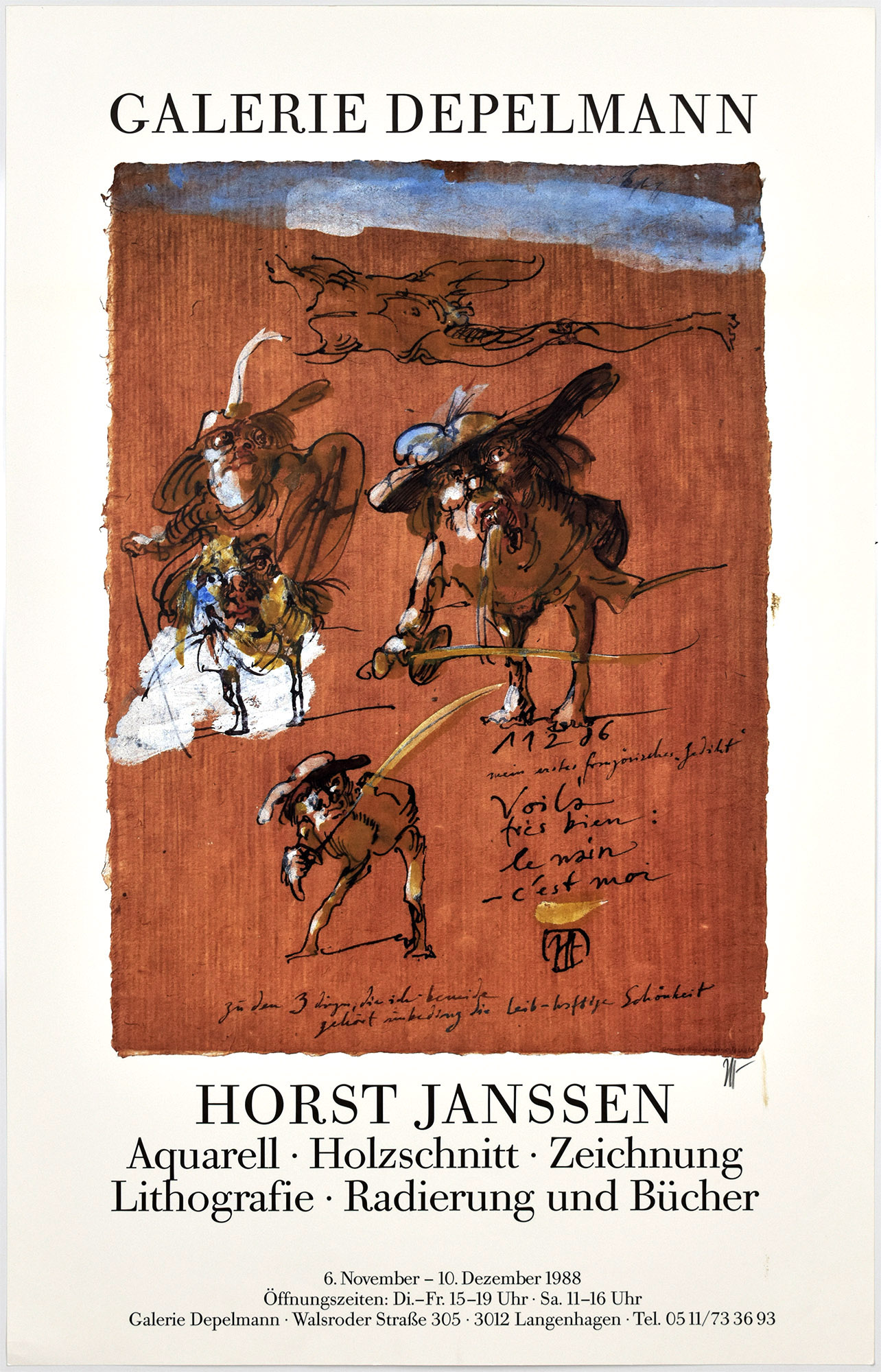 Original-Plakat (Farboffsetdruck) auf weißem Papier. Plakat zur Janssen-Ausstellung in der Galerie Depelmann, Langenhagen, November – Dezember 1988. Unterhalb der Abbildung von Horst Janssen in Blei signiert. Nicht im Werkverzeichnis Meyer-Schomann. Maße Blatt: 70,5 x 43,5 cm. Sehr gutes Exemplar.