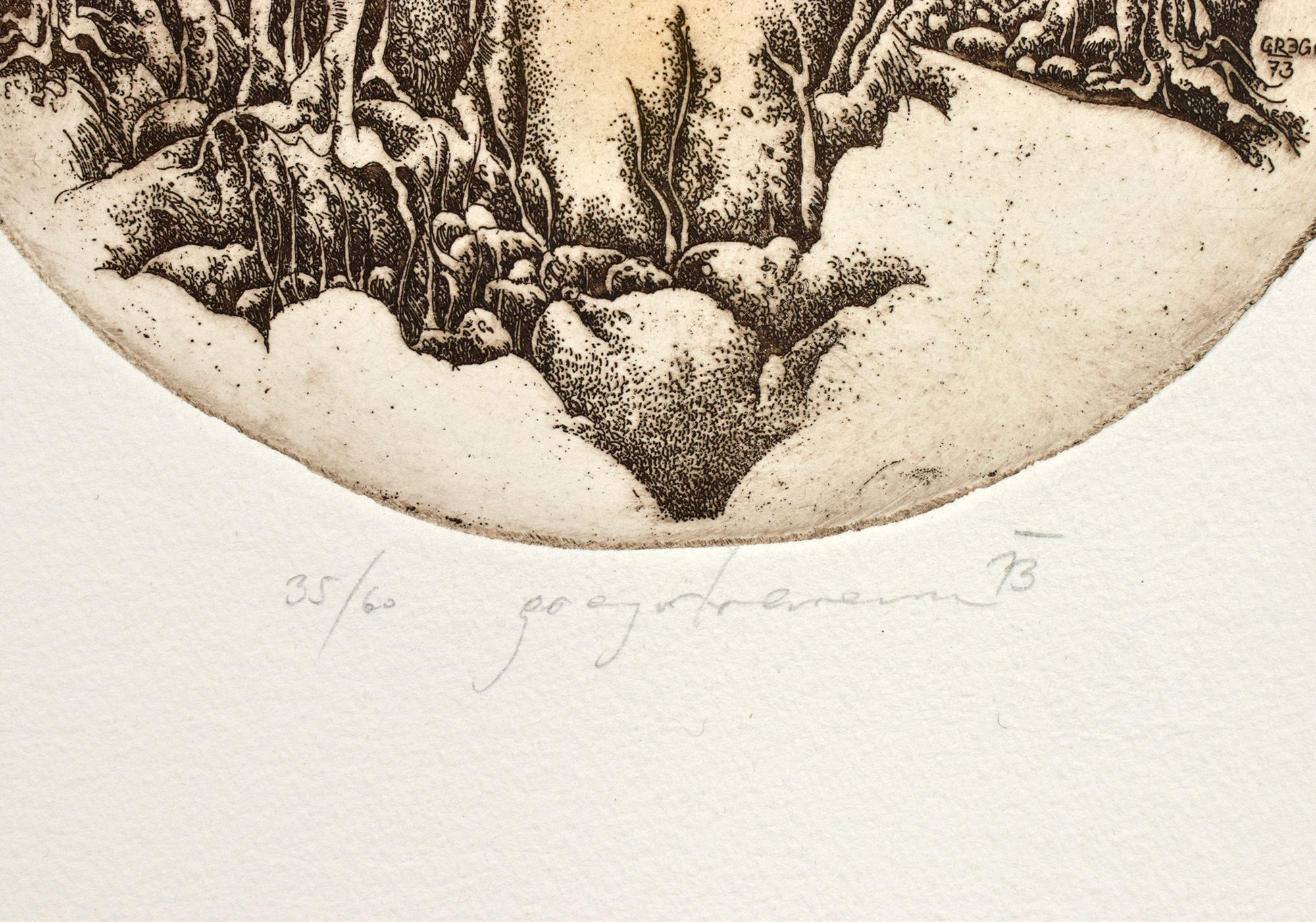 Number 35 of 60 original color etchings on laid paper. Dated (74) and signed in lead by Gregor Traversa below the image. Sheet dimensions: 44.5 x 39.0 cm. Image dimensions, diameter: 15.0 cm. Very good copy.