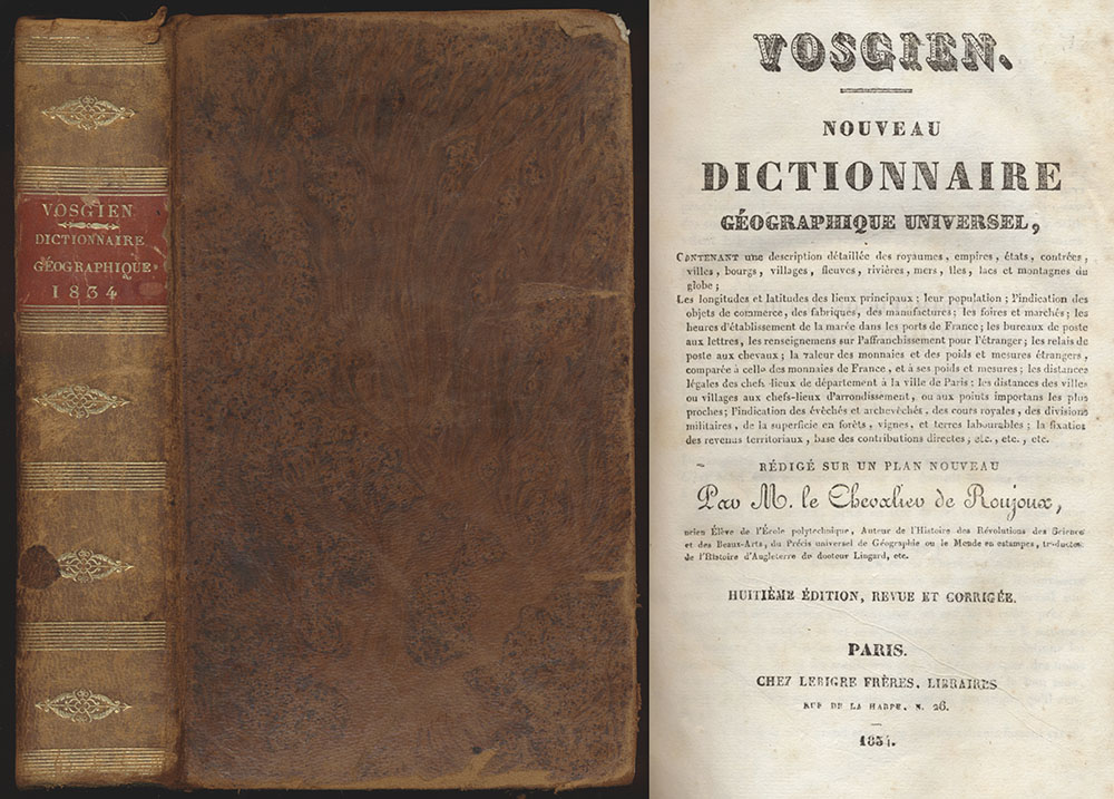 Vosgien, [Francoise-Leopold]: Nouveau Dictionaire Geographique Universel. Paris, Belin-Mandar, Libraire [u.a.], o.J. [c. 1835]. 8°. 22 cm x 14 cm. 694 Seiten. Original-Ledereinband, marmoriert, mit goldgeprägtem Rückentitel sowie Rückenornamenten. Marmorschnitt.