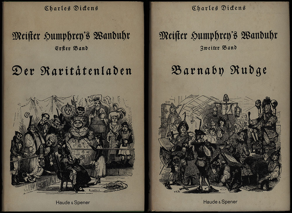 Dickens, Charles: Meister Humphrey’s Wanduhr. Erster Band: Der Raritätenladen. Zweiter Band: Barnaby Rudge. Mit Bildern von George Cattermole und H. K. Browne genannt Phiz. Herausgegeben von Dr. M. Färber. 2 Bände (komplett). Berlin, Haude & Spenersche Verlagsbuchhandlung, 1970. 4°. 26 x 17 cm. 600, 605 Seiten. Original-Leinenbände mit Original-Schutzumschlägen und gelben Kopfschnitten.