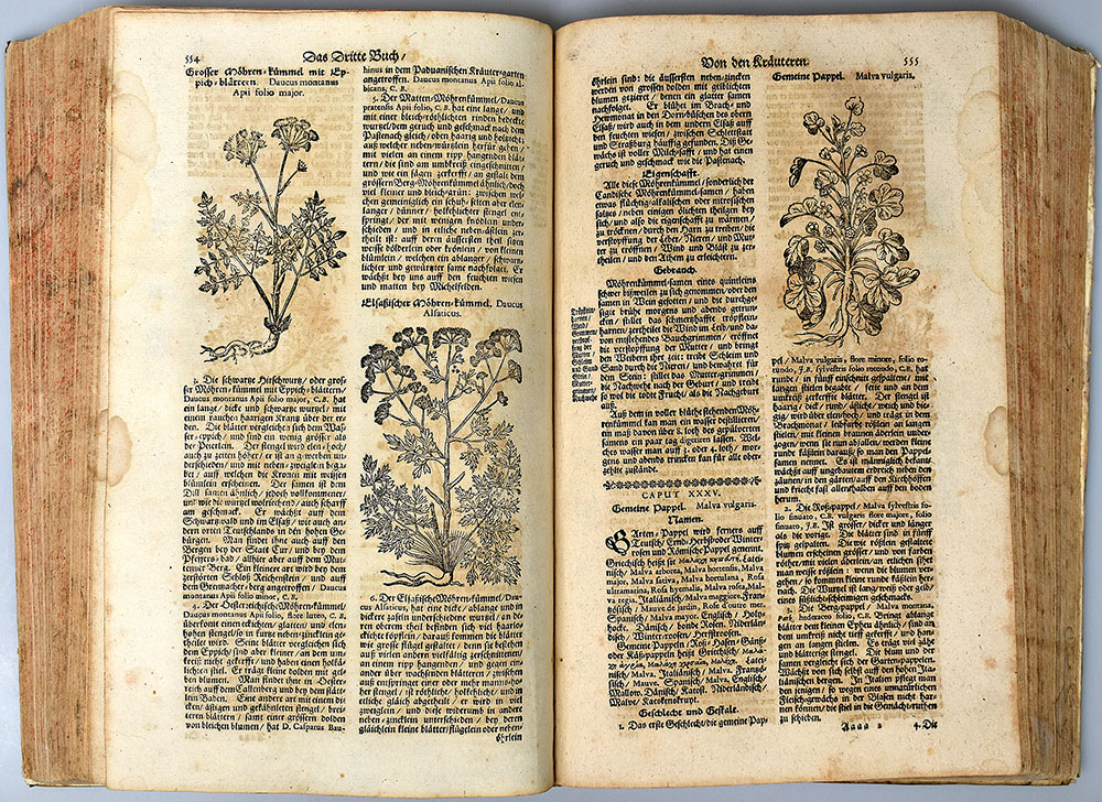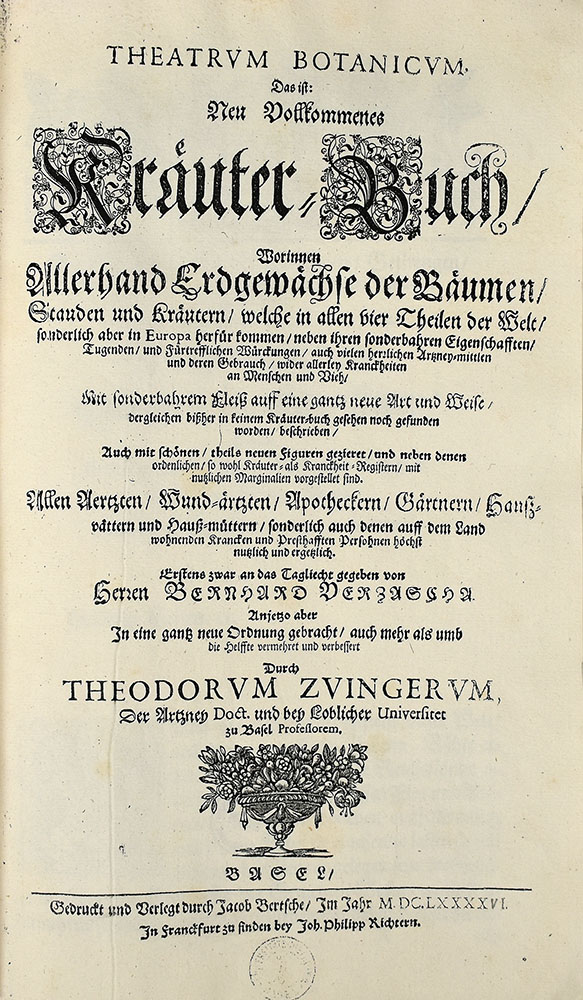 Zwinger, Theodor [Bearb.]: Theatrum Botanicum, Das ist: Neu Vollkommenes Kräuter-Buch. Worinnen Allerhand Erdgewächse der Bäumen, Stauden und Kräutern, welche in allen vier Theilen der Welt, sonderlich aber in Europa herfür kommen, neben ihren sonderbahren Eigenschafften, Tugenden, und Fürtrefflichen Würckungen, auch vielen herrlichen Artzney-mittlen und deren Gebrauch/ wider allerley Kranckheiten an Menschen und Vieh, Mit sonderbahrem Fleiß auff eine gantz neue Art und Weise […] beschrieben, Auch mit schönen, theils neuen Figuren gezieret, und neben denen ordenlichen, so wohl Kräuter- als Kranckheit-Registern, mit nutzlichen Marginalien vorgestellet sind. Allen Aertzten, Wund-ärtzten, Apotheckern, Gärtnern, Hauß-vättern und Hauß-müttern, sonderlich auch denen auff dem Land wohnenden Krancken und Presthafften Persohnen höchst nutzlich und ergetzlich. Basel, Verlag Jacob Bertsche, 1696. 2°. 35,5 x 23 cm. [3] Blatt, 995 Seiten, [26] Blatt. Pergamentband der Zeit.