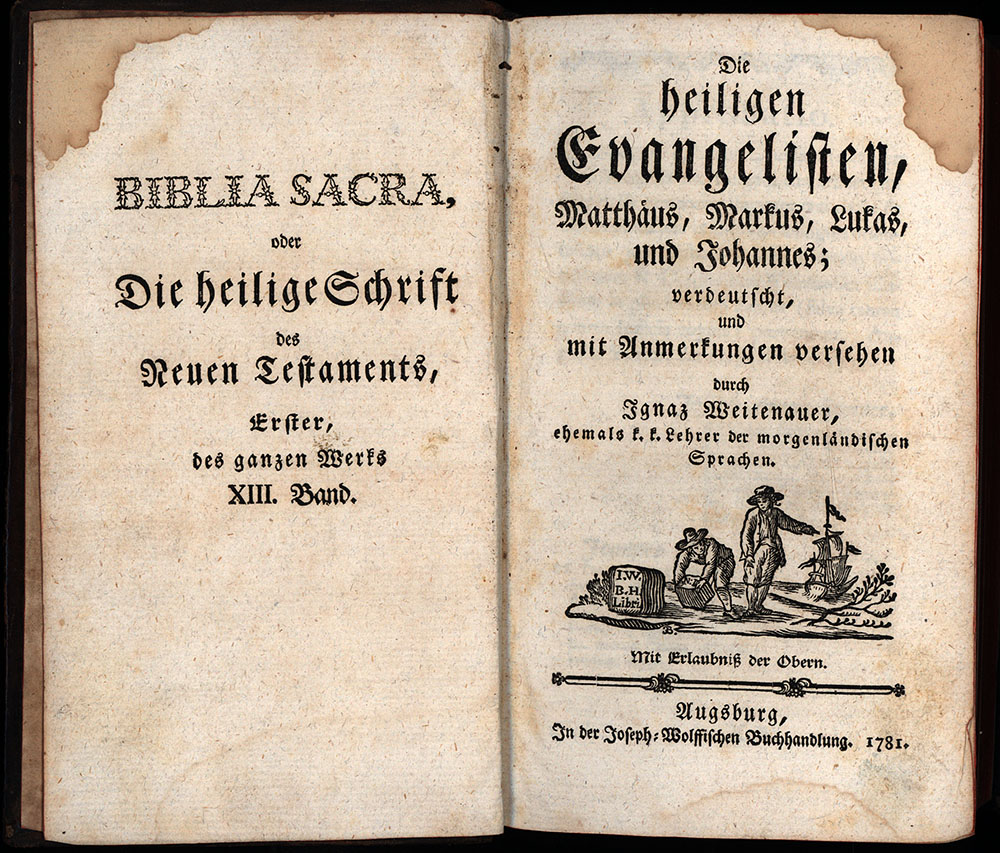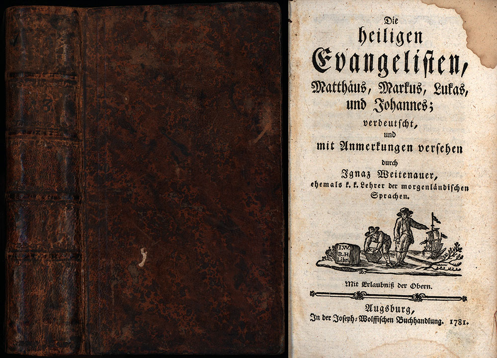 Weitenauer, Ignaz: Die heiligen Evangelisten, Matthäus, Markus, Lukas und Johannes. Augsburg, Verlag Joseph Wolff, 1781. 8o. [8] Blatt, 624 Seiten, [8] Blatt. Lederband der Zeit auf 4 Bünden mit Rundum-Rotschnitt. (= Biblia sacra, oder die heilige Schrift des alten Testaments; Biblia sacra, oder die heilige Schrift des neuen Testaments Erster, des ganzen Werks 13. Band).