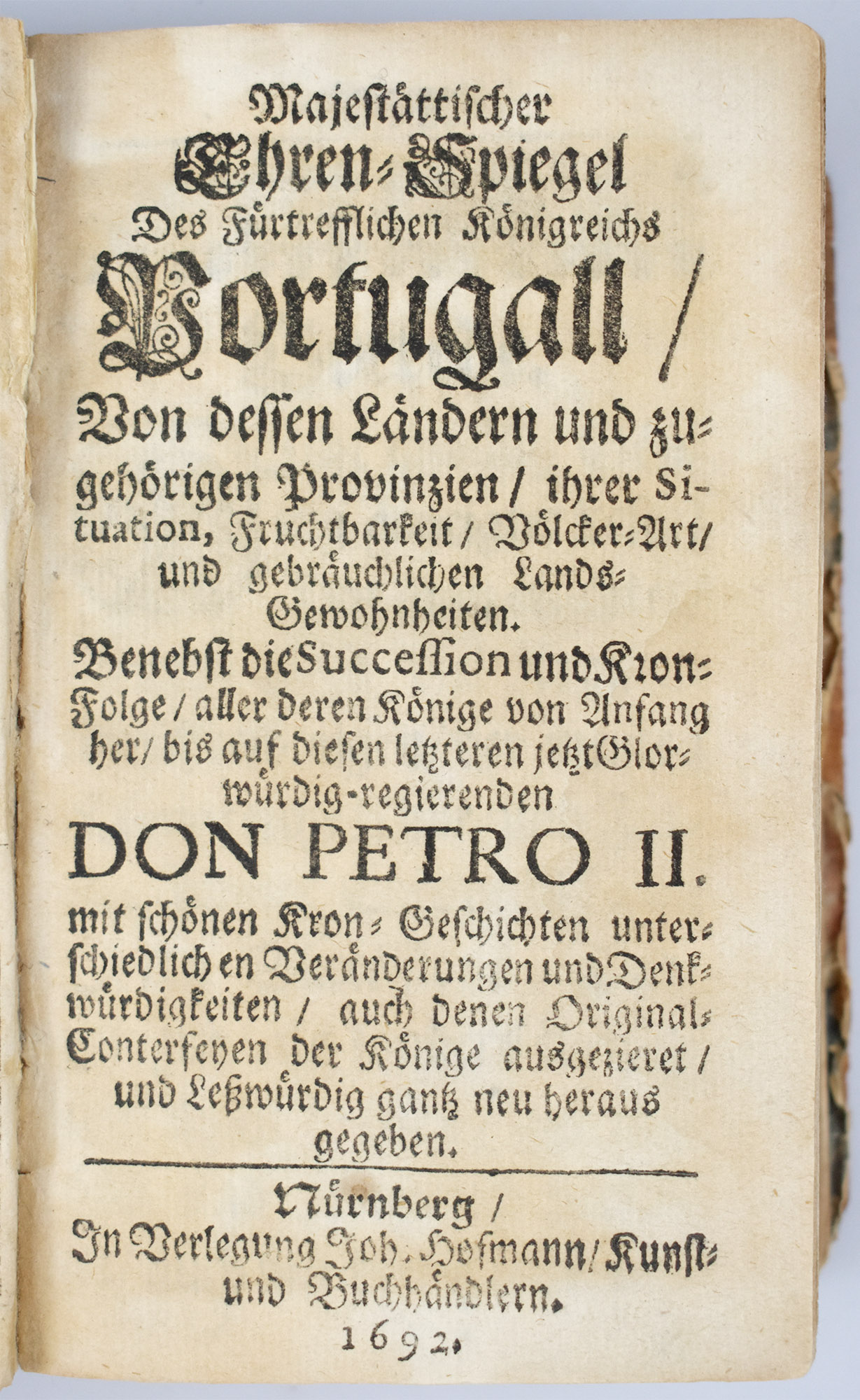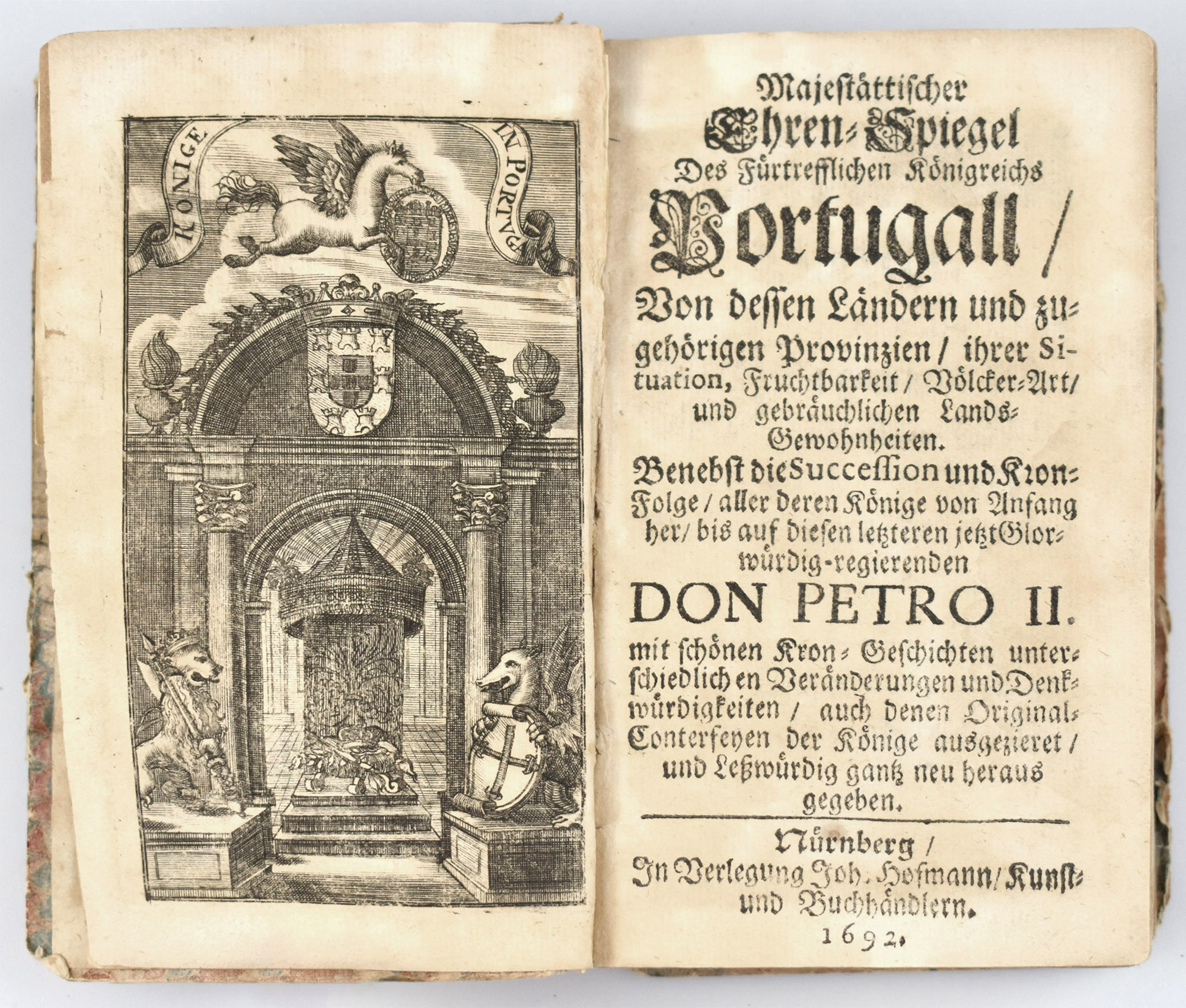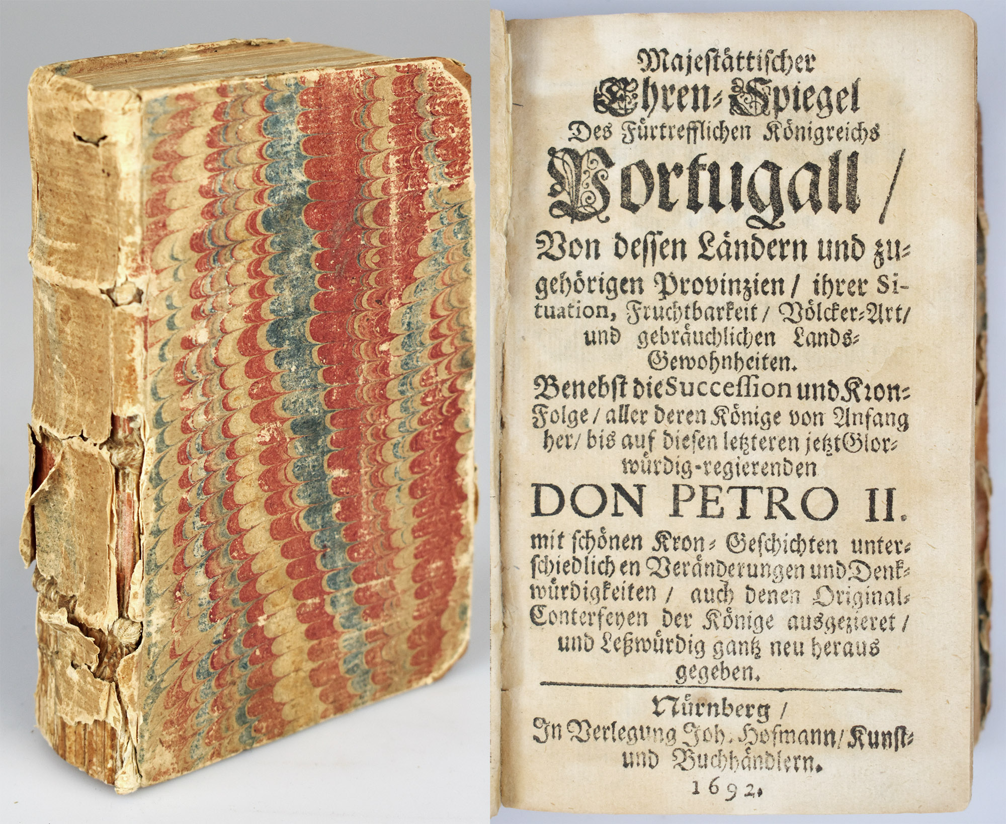 Majestättischer Ehren-Spiegel Des Fürtrefflichen Königreichs Portugall. Von dessen Ländern und zugehörigen Provinzien, ihrer Situation, Fruchtbarkeit […]. Benebst die Succession und Kron-Folge, aller deren Könige von Anfang her, bis auf diesen letzteren jetzt Glorwürdig-regierenden Don Petro II. mit schönen Kron-Geschichten […]. Nürnberg, Verlag Johannes Hofmann, 1692. 16°. 13,5 x 8 cm. [5] Blatt, 302 [recte 312] Seiten. Frontispiz und 24 Tafeln. Einband der Zeit aus Holzdeckeln mit farbigem Kamm-Marmorpaper.