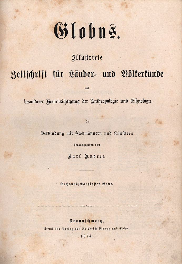 Andree, Karl: Globus. illustrierte Zeitschrift für Länder- und Völkerkunde mit besonderer Berücksichtigung der Anthropologie und Ethnologie. Jahrgang 1874 mit 24 Nummern in 1 Band [komplett]. Braunschweig, Vieweg Verlag, 1874. 4°. 31 x 23 cm. VIII, 384 Seiten. Halblederband der Zeit mit blindgeprägtem Deckeltitel.