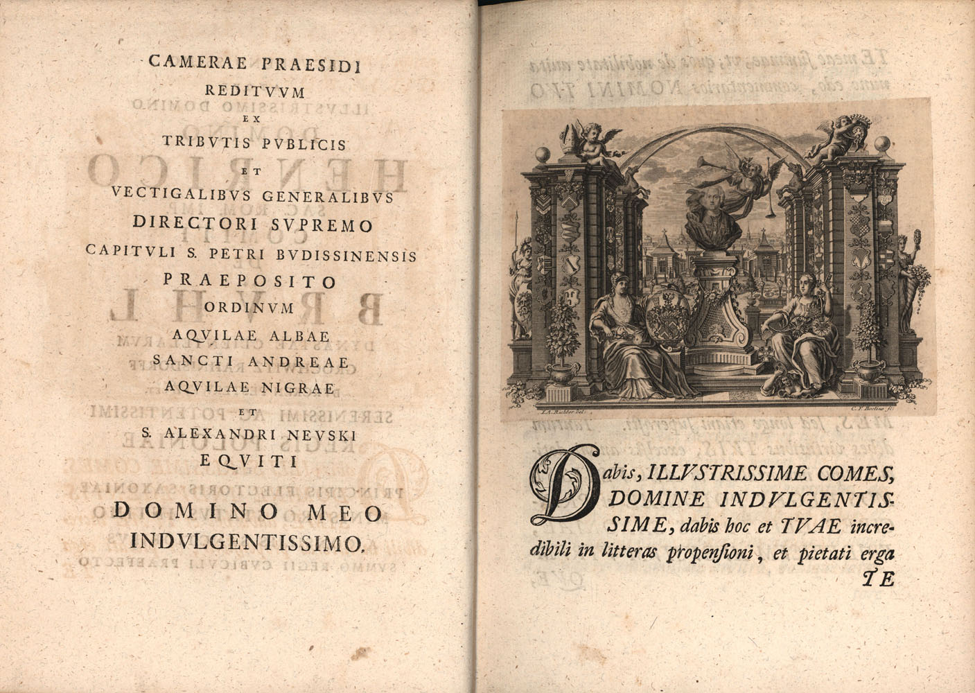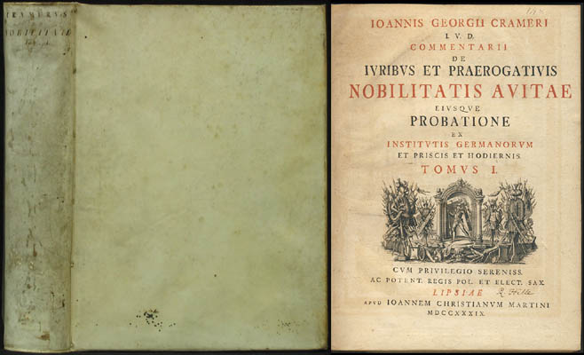 Cramer, Johann Georg: Commentarii de Ivribus et Praerogativis Nobilitatis Avitae. Eiusque Probatione ex Institutis Germanorum et priscis et Hodiernis. Tomus I. (alles erschienene). Leipzig, Johann Christian Martin, 1739. 4°. 26 cm. Kupferstich als Frontispiz, Titel in Rot und Schwarz, 6 Blatt, 576 Seiten, 12 Blatt. Pergamentband der Zeit.
