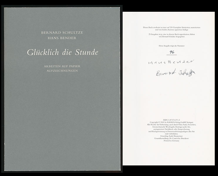 Schultze, Bernard – Bender, Hans: Glücklich die Stunde. Arbeiten auf Papier. Aufzeichnungen. [Signiertes Exemplar.] Stuttgart, Radius-Verlag, 2003. Groß-8°. 24 cm. 79 Seiten. Original-Klappenbroschur im Original-Pappschuber. Als Blockbuch gebunden. (edition galerie).