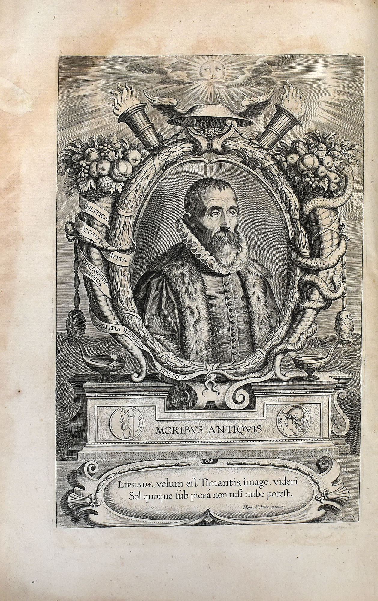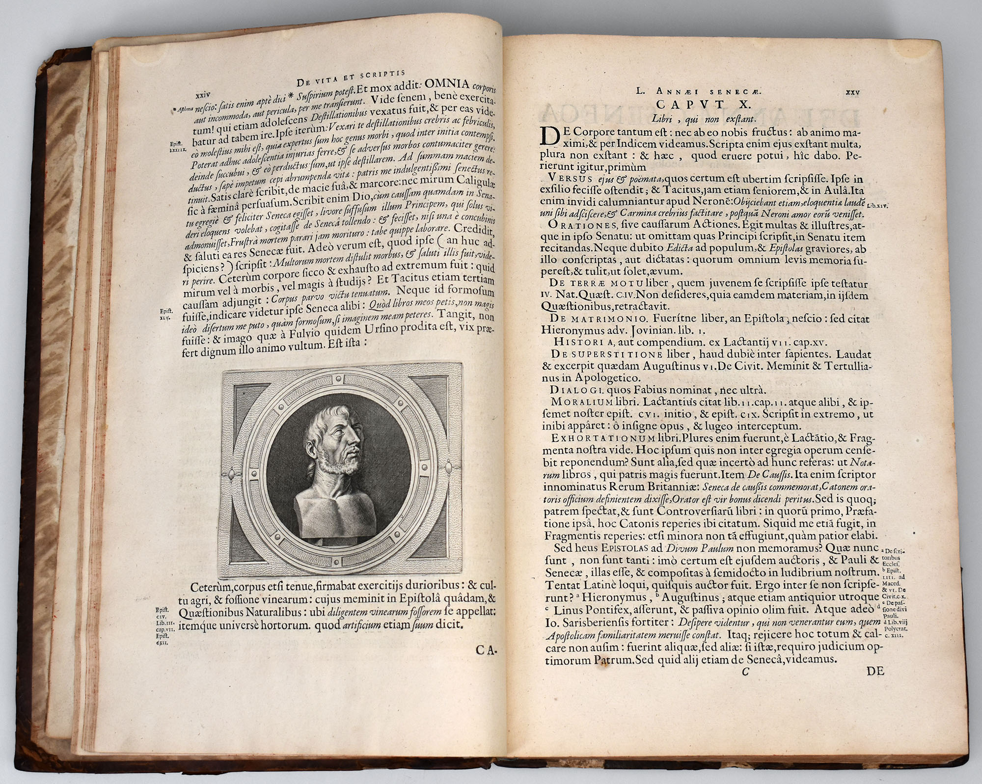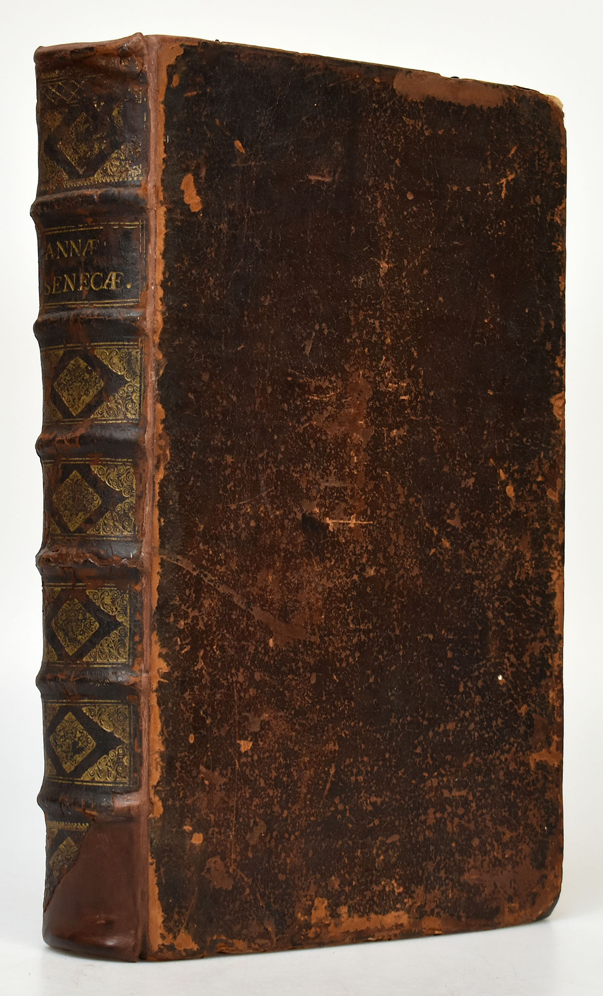 4. Ausgabe bei Plantin/Moretus. Ausgabe in Latein. Graesse VI, 348. Brunet V, 275. Dibdin II, 397. Mit durch Cornelius Gallus dem Älteren gestochenem Portrait von Lipsius als Frontispiz (Medaillon auf Sockel mit zweizeiligem Hymnus durch Henri d’Oultreman), allegorischem Kupfertitel, einem 18-zeiligen Textkupferstich (Portrait Senecas) und einem blattgroßen Kupferstich (Seneca im Bad) durch Gallus, primären und sekundären Rankeninitialen in Holzschnitt, Holzschnittvignetten und Anmerkungsapparat. Nach der im Jahr 1605 von Lipsius letzter Hand herausgegebenen ersten Ausgabe und von Libert Fromond vermehrt. Einband etwas berieben und bestoßen, ursprünglicher aufkaschierter Lederbezug mit Fehlstellen, Vorsätze stark leimschattig, fliegendes Blatt und Frontispiz etwas gelockert, Seiten insgesamt leicht bis stellenweise stärker gebräunt und gering stockfleckig, wenige Seiten mit blassem Wasserrand (minimal nachgebräunt, nicht wellig, keine Textberührung). Gutes Exemplar.