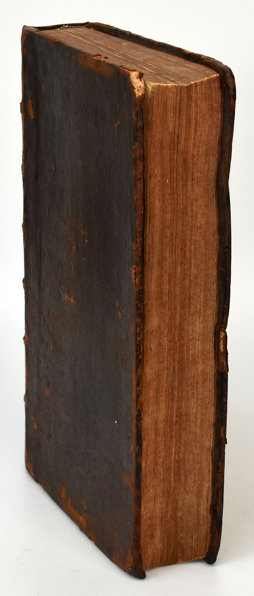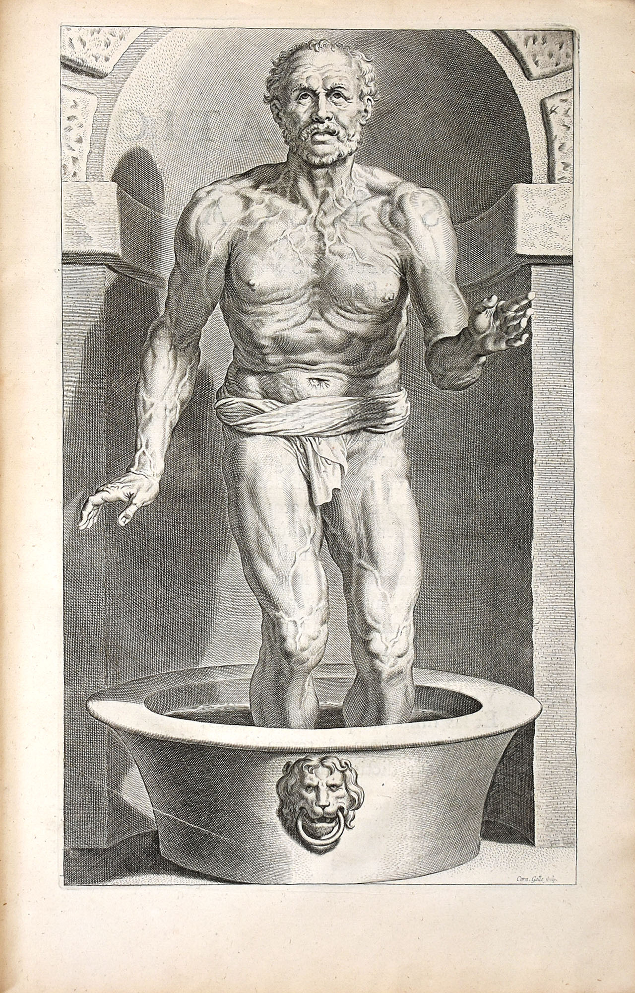 Restored leather binding of the times with 6 raised bands, gilt-stamped spine title, rich floral gilt on the spine and red sprinkled edges. 4th edition by Plantin/Moretus. Edition in Latin. Graesse VI, 348. Brunet V, 275. Dibdin II, 397. With a portrait of Lipsius engraved by Cornelius Gallus the Elder as frontispiece (medallion on base with two-line hymn by Henri d’Oultreman), allegorical engraved title page, an 18-line text engraving (portrait of Seneca) and a folio-sized engraving (Seneca in the bath) by Gallus, primary and secondary scrollwork initials in woodcut, woodcut vignettes and imprinted annotations. After the first edition published in 1605 by Lipsius last hand and enlarged by Libert Fromond. Binding a bit rubbed and bumped, original laminated leather cover with losses, endpapers shaded with bookbinder glue, flyleaf and frontispiece a bit loosened, pages overall slightly to partly a bit stronger darkened and slightly foxed, a few pages with pale tidemark (minimally darkened, not wavy, not touching the text). Good copy.