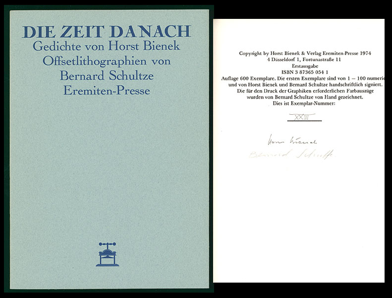 Bienek, Horst und Schultze, Bernard: Die Zeit danach. Gedichte von Horst Bienek. Offsetlithographien von Bernard Schultze. [Signierte Vorzugsausgabe]. Düsseldorf, Eremiten-Presse, 1973/1974. 4°. 30 cm. Unpaginiert. [65 Seiten]. Original-Broschur.