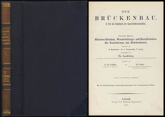 Baumeister, R.; Heinzerling, F.; Lorey, F.; Landsberg, Th.[Hrsg.]: Der Brückenbau. 2. Band . Die eisernen Brücken im allgemeinen. Theorie der eisernen Balkenbrücken. Leipzig, Wilhelm Engelmann, 1904. 4°. 26 cm. X,250 (2) Seiten. Original-Halblederband mit goldgeprägtem Rückentitel.
