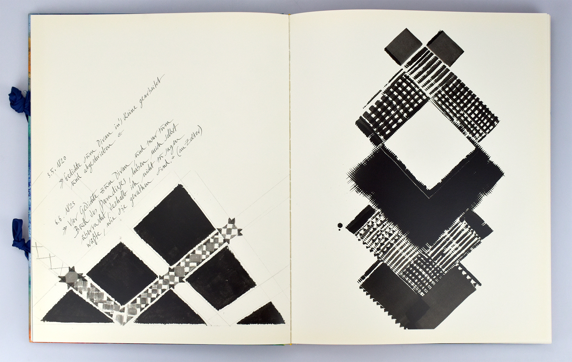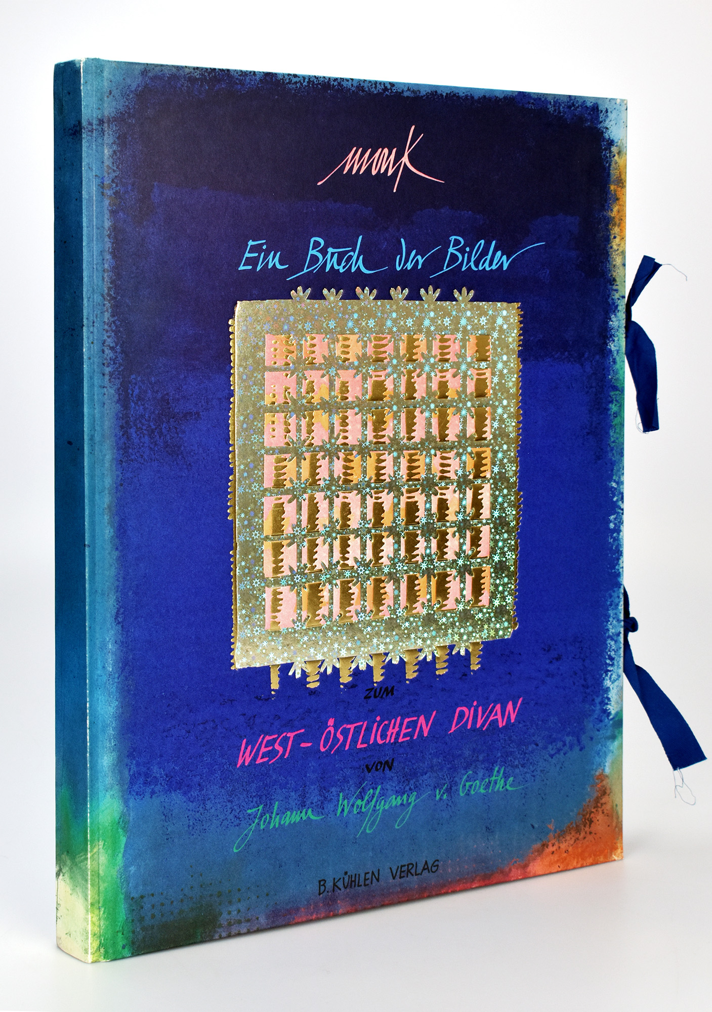 Mack, Heinz: Ein Buch der Bilder zum West-östlichen Divan von Goethe. Mönchengladbach, Kühlen Verlag, 1999. 2°. 45 x 35 cm. [164] Seiten. Original-Pappband mit Schleifenverschluss.