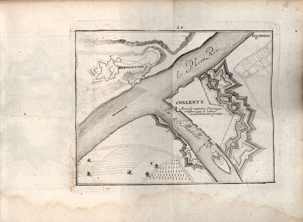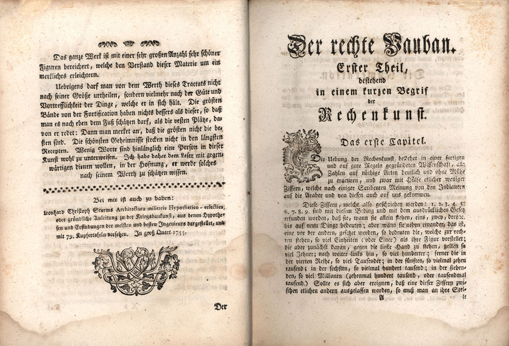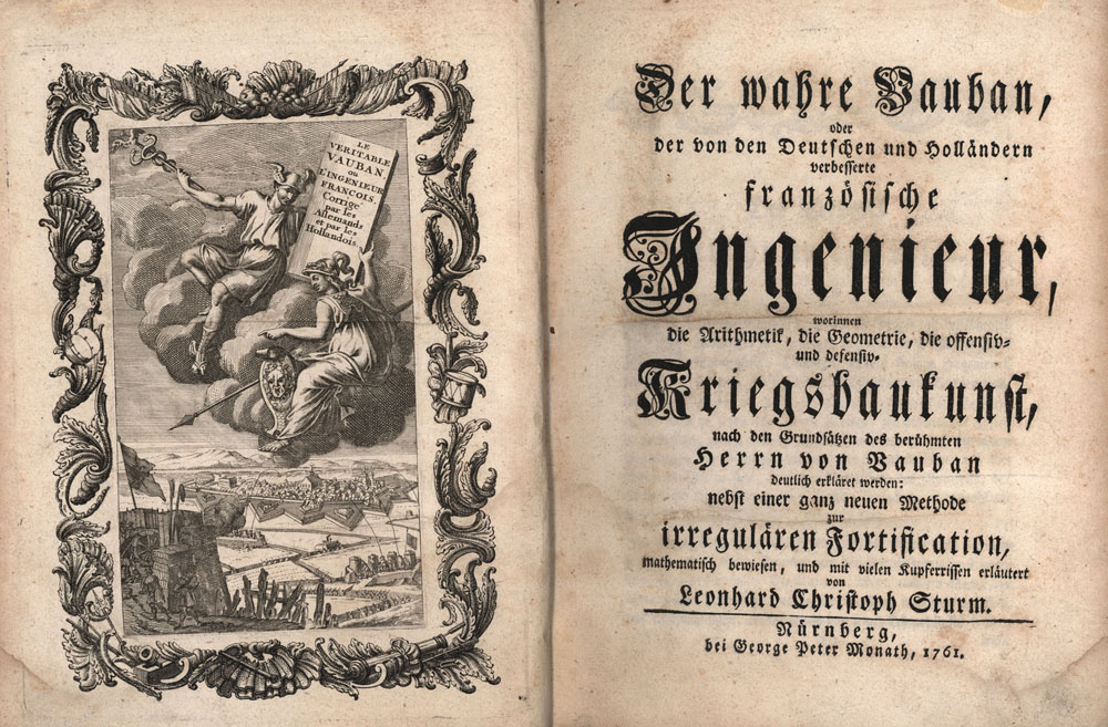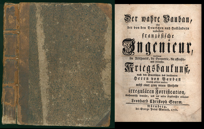 Sturm, Leonhard Christoph: Der wahre Vauban, oder der von den Teutschen und Holländern verbesserte französische Ingenieur. Worinnen die Arithmetic, die Geometrie, die offensiv- und defensiv- Kriegsbaukunst nach den Grundsätzen des berühmten Herrn von Vauban deutlich erkläret werden, nebst einer ganz neuen Methode zur irregulären Fortifikation, mathematisch bewiesen, und mit vielen Kupferrissen erläutert. [Beigebunden:] Bericht von Belagerung und Verteidigung einer Festung, verfasset durch den Herrn von Goulon. Nürnberg, George Peter Monath, 1761. Groß-8°. 23,5 cm. 4 Blatt, 157 (1) Seiten, 5 Blatt, 56 Seiten, 35 zwischengebundene Faltblätter mit Kupfern. Halblederband der Zeit.