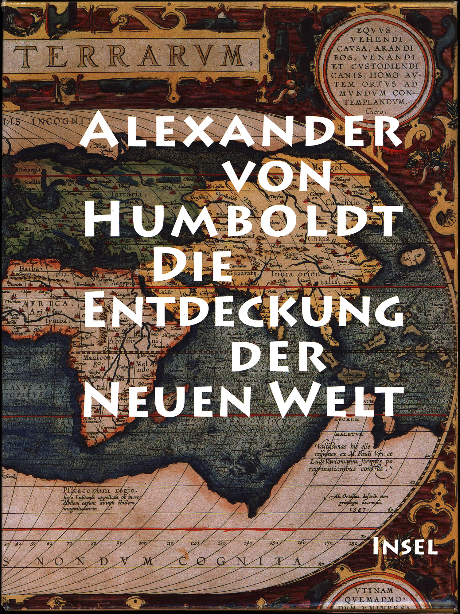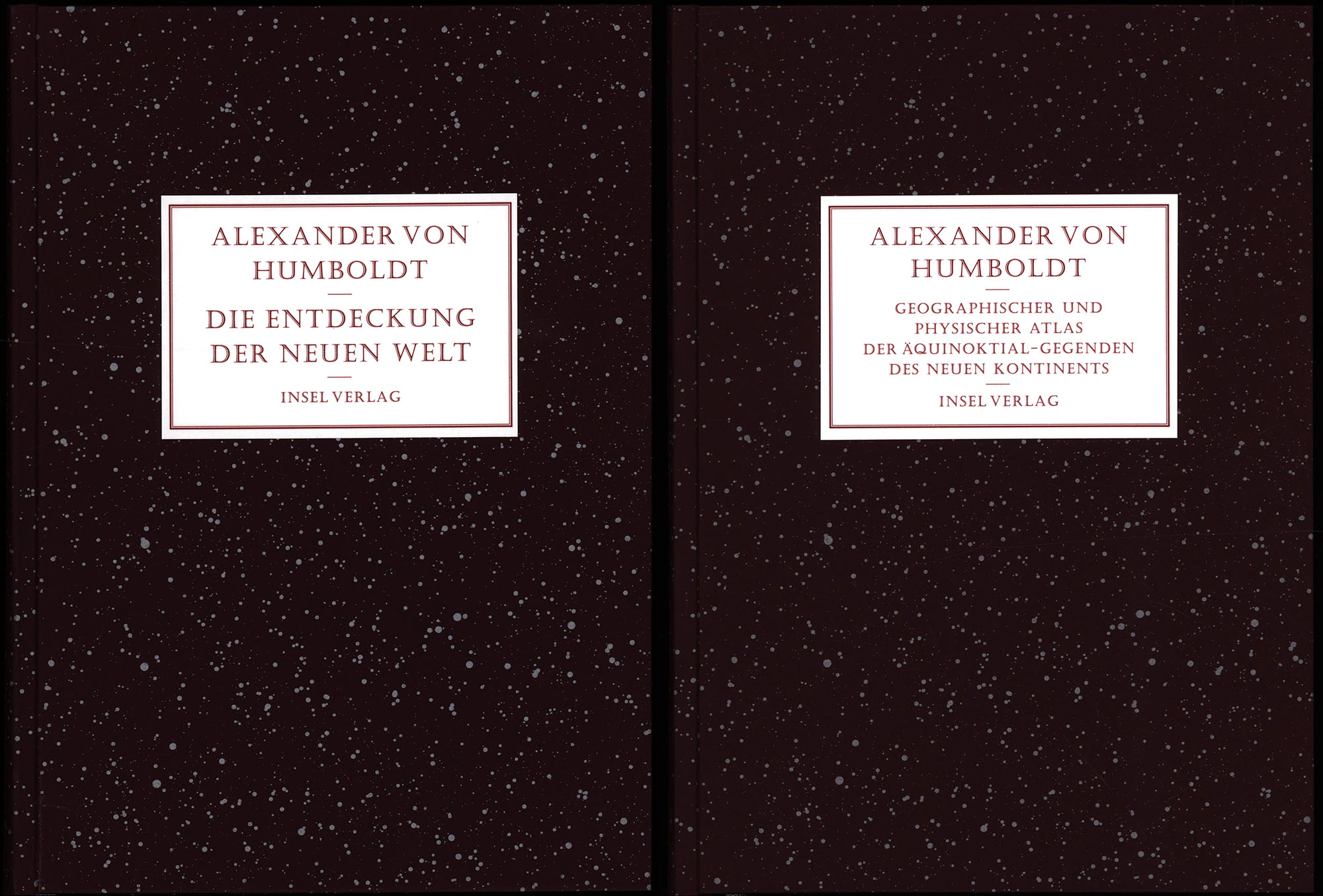 Humboldt, Alexander von – Ideler, Julius Ludwig (Hrsg.): Die Entdeckung der Neuen Welt. Textband: Kritische Untersuchung zur Historischen Entwicklung der geographischen Kenntnisse von der Neuen Welt und den Fortschritten der nautischen Astronomie im 15. und 16. Jahrhundert. Mit dem geographischen und physischen Atlas der Äquinoktial-Gegenden des Neuen Kontinents Alex von Humboldts sowie dem Unsichtbaren Atlas der von ihm untersuchten Kartenwerke. Mit einem vollständigen Namen- und Sachregister. Nach der Übersetzung aus dem Französischen von Julius Ludwig Ideler ediert und mit einem Nachwort versehen von Ottmar Ette. Atlasband: Geographischer und physischer Atlas der Äquinoktial-Gegenden des neuen Kontinents. Unsichtbarer Atlas aller von Alexander von Humboldt in der Kritischen Untersuchung aufgeführten und analysierten Karten. 2 Bände (komplett). Frankfurt am Main/Leipzig, Insel-Verlag, 2009. 4°. 31 x 23 cm. 534; 247 Seiten. Original-Pappbände. Illustrierter Original-Pappschuber. (Die Entdeckung der Neuen Welt).