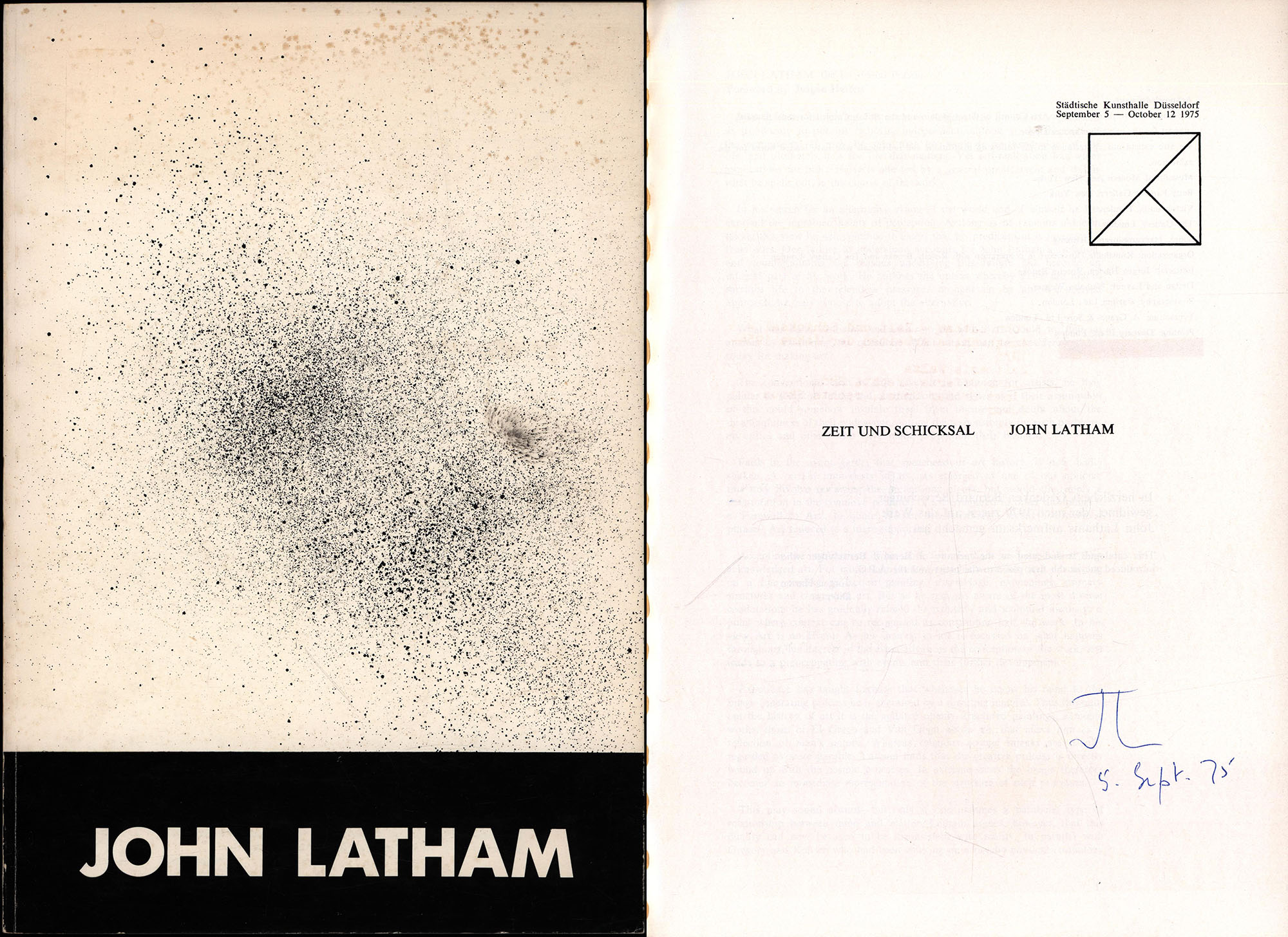 Latham, John: Zeit und Schicksal. John Latham. Städtische Kunsthalle Düsseldorf, September 5 – October 12, 1975. [Signiertes Exemplar]. Düsseldorf, Selbstverlag der Kunsthalle, 1975. 4°. 30 x 20,5 cm. 34 Seiten. Original-Broschur.