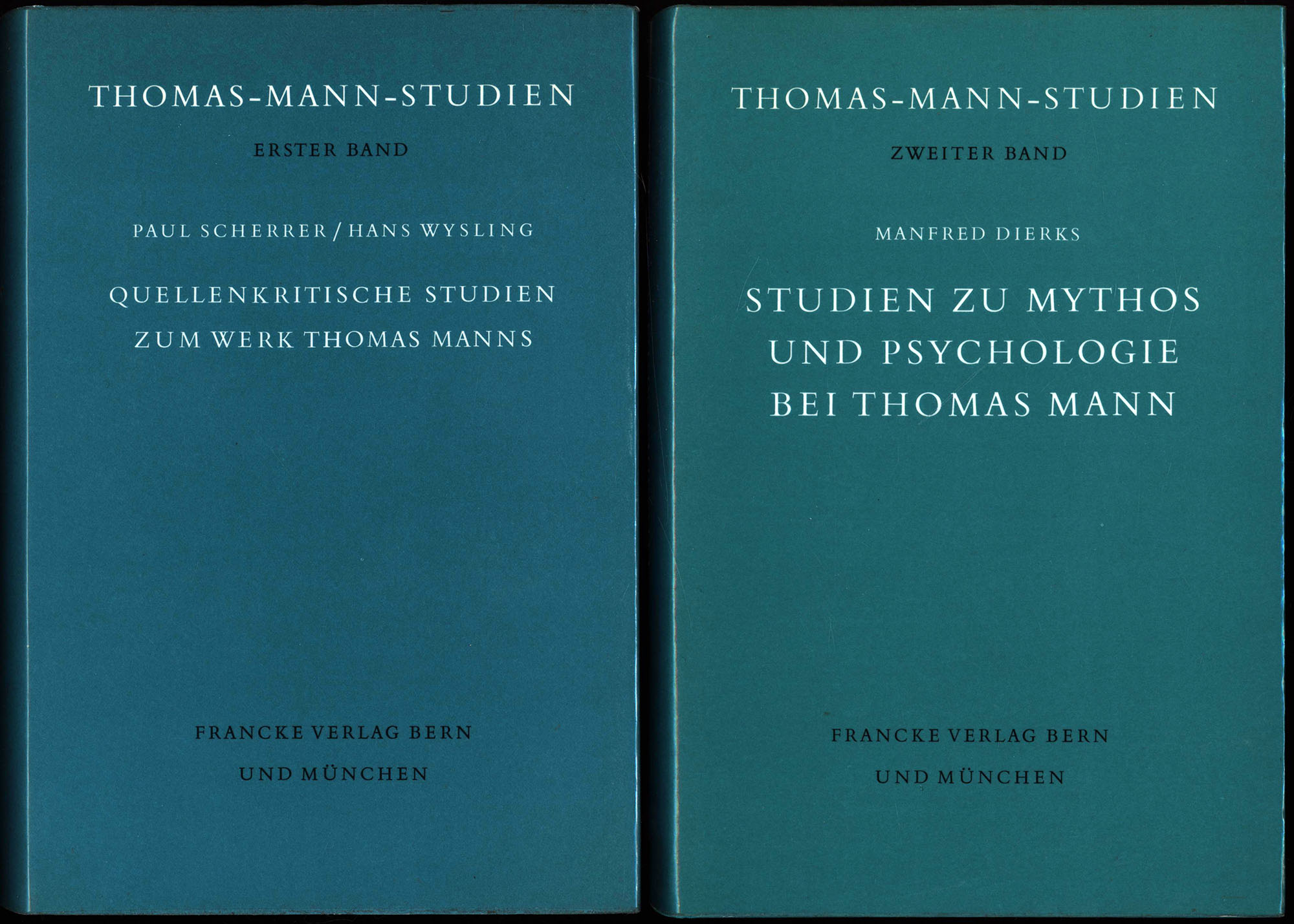 Scherrer, Paul und Wysling, Hans: Quellenkritische Studien zum Werk Thomas Manns. Bern und München, Francke Verlag, 1967. Groß-8°. 24 x 17 cm. 346; 293 Seiten. Original-Leinenbände mit Original-Schutzumschlägen. (= Thomas-Mann-Studien, Band 1 und 2).