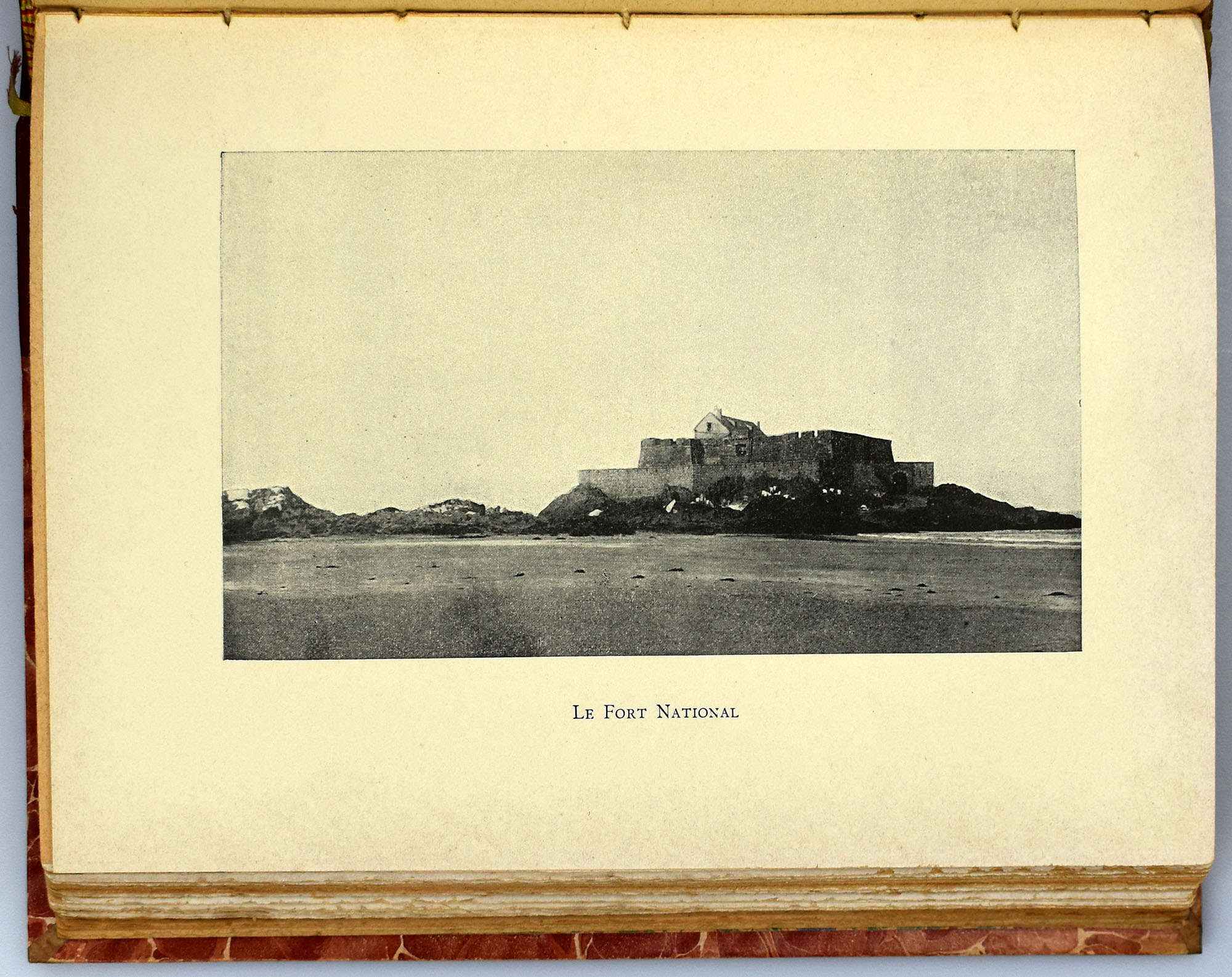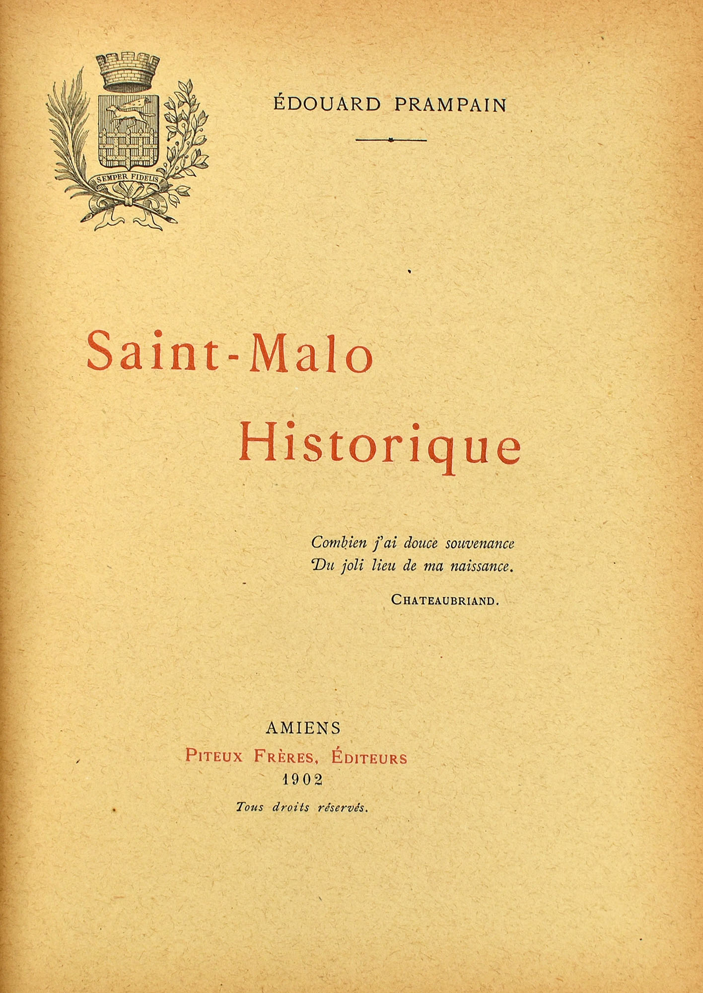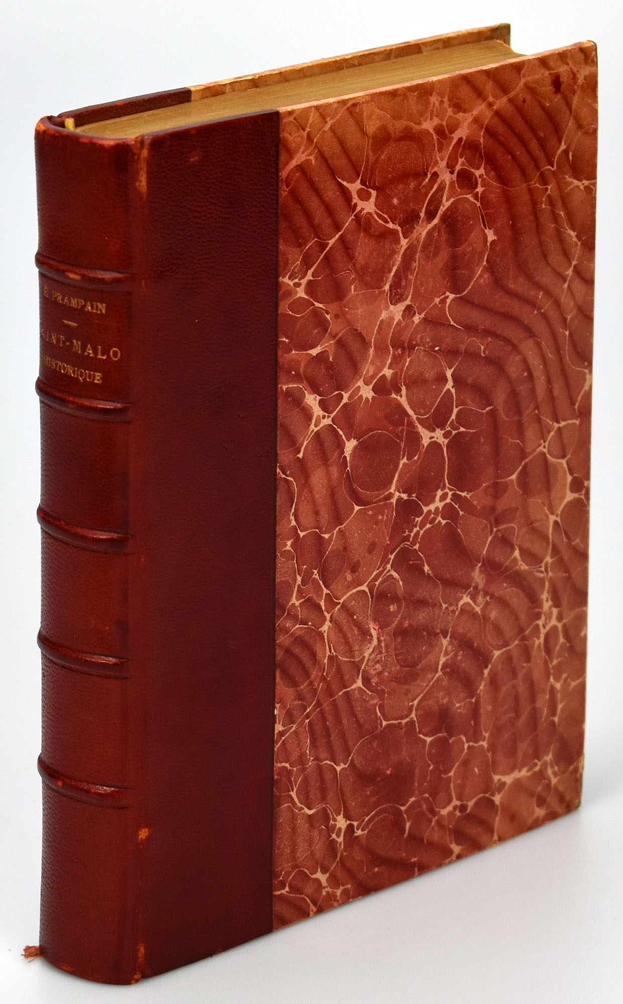 Prampain, Édouard: Saint-Malo Historique. Amiens, Verlag Pitreux frères, 1902. 8°. 19,5 x 14,5 cm. XX, 305 Seiten. Handeinband von Vauthrin in rotem Halbleder auf 5 Zierbünden mit goldgeprägtem Rückentitel, marmoriertem Deckelbezug, marmorierten Vorsätzen und Kopfgoldschnitt.