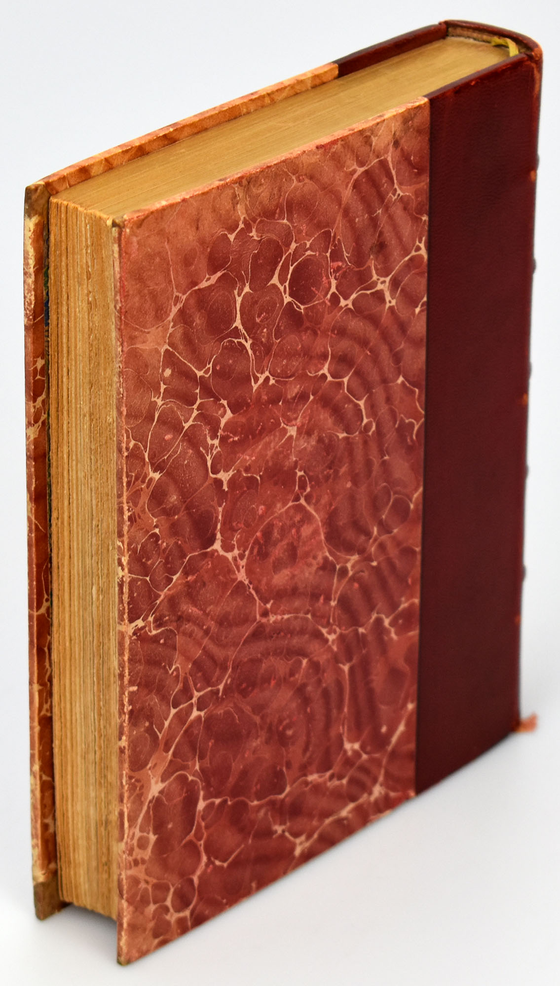 Hand binding by Vauthrin in red half leather with five raised bands, gilt title on spine, marbled paper-covered boards, marbled endpapers, and gilt top edge. First edition. French-language edition. With 29 black-and-white plates showing photographs and plans. With architect Ogden Codman’s bookplate. The original wrappers are bound in and the book block is trimmed on one edge and untrimmed on the others. With stamped binder’s mark on verso of the flyleaf. Binding slightly rubbed and minimally faded at edges. Bound-in wrappers slightly foxed. Pages darkened. Near fine copy overall.