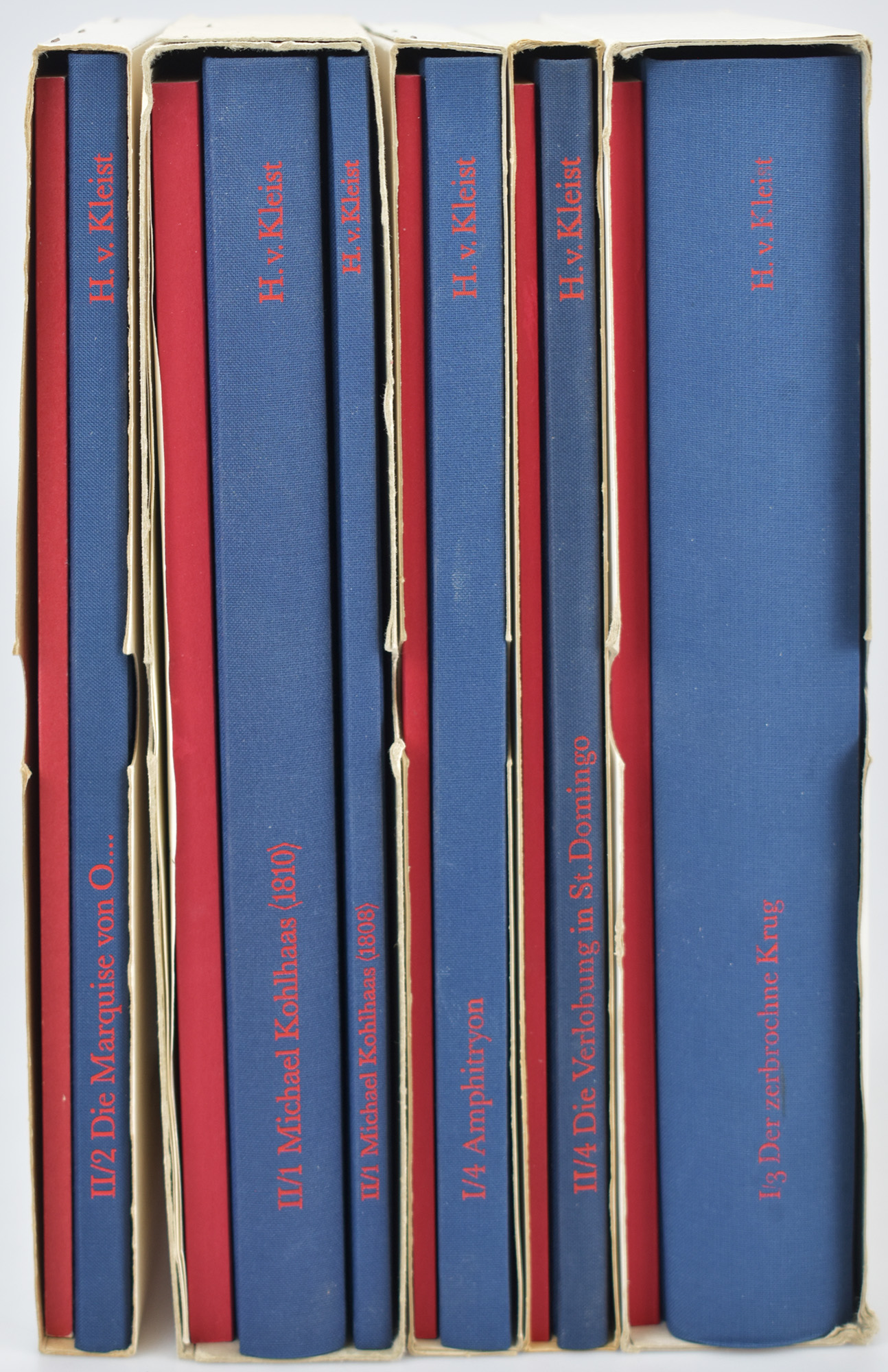 Kleist, Heinrich von Reuß, Roland (Hrsg.) und Staengle, Peter (Hrsg.): Sämtliche Werke. Brandenburger Ausgabe. Band I/3: Der zerbrochne Krug. Brandenburger Kleist-Blätter 8. Band I/4: Amphitryon. Berliner Kleist-Blätter 4. II/1: Michael Kohlhaas (1808). Michael Kohlhaas (1810). Berliner Kleist-Blätter 3. Band II/2: Die Marquise von O… Berliner Kleist-Blätter 2. Band II/4: Die Verlobung in St. Domingo. Berliner Kleist-Blätter 1. 5 Bände (von 22, in 6 Bänden und 5 Heften). Basel/Frankfurt am Main, Stroemfeld Verlag/ Roter Stern, 1988-1995. 4°. 28 x 18,5 cm. 448, 105; 145, 65; 53, 301, 125; 107, 80; 94, 45 Seiten. Original-Leinenband sowie Original-Karton in Pappschuber. (= Heinrich von Kleist, sämtliche Werke, Brandenburger Ausgabe, kritische Edition sämtlicher Texte nach Wortlaut, Orthographie, Zeichensetzung aller erhaltenen Handschriften und Drucke, eine Edition des Instituts für Textkritik e. V., Band II/ 5).
