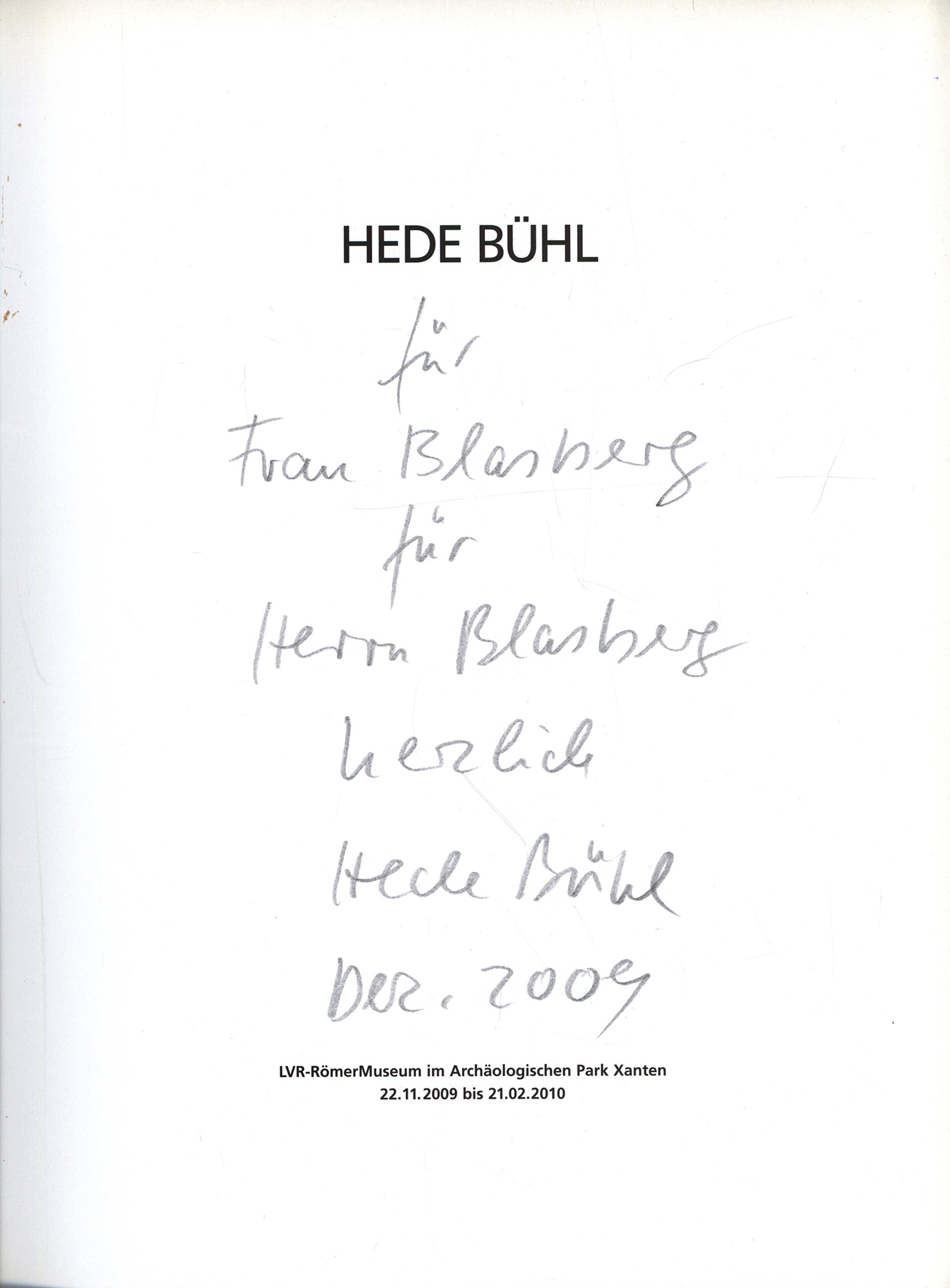 1. Auflage. Mit personalisierter, mehrzeiliger Widmung in Blei auf Titelblatt, signiert von Hede Bühl und datiert auf Dezember 2009, 2 beiliegenden Postkarten Hede Bühls an das Ehepaar Wilhelm Blasberg und einer Ausstellungseinladung mit signierter, dreizeiliger Widmung in Tinte durch die Künstlerin. Publikation anlässlich der Ausstellung im LVR-RömerMuseum im Archäologischen Park Xanten 22.11.2009 bis 21.2.2010. Überwiegend bebildert mit blatt- und doppelblattgroßen Fotoabbildungen, zumeist in Farbe. Neuwertiges Exemplar.