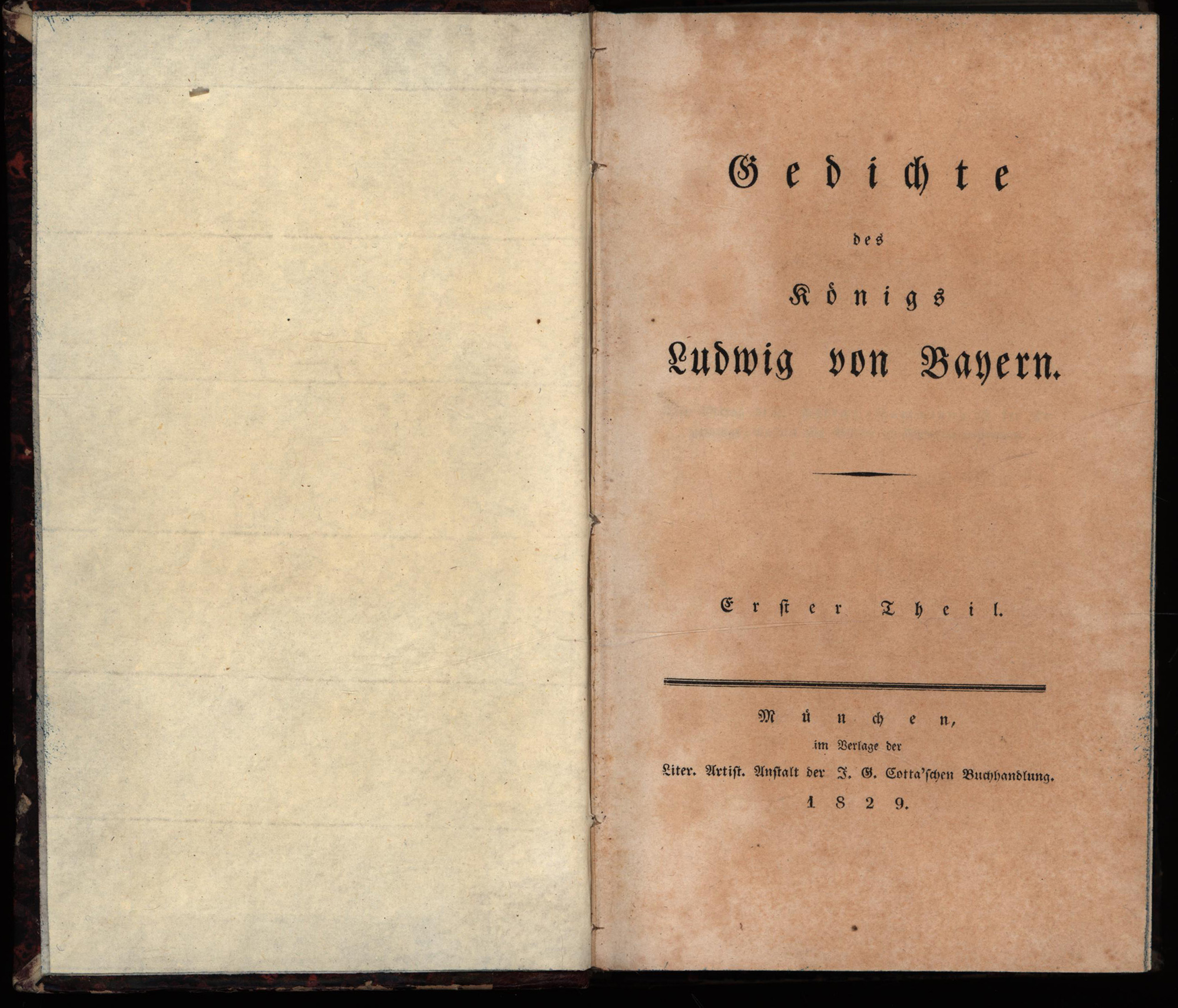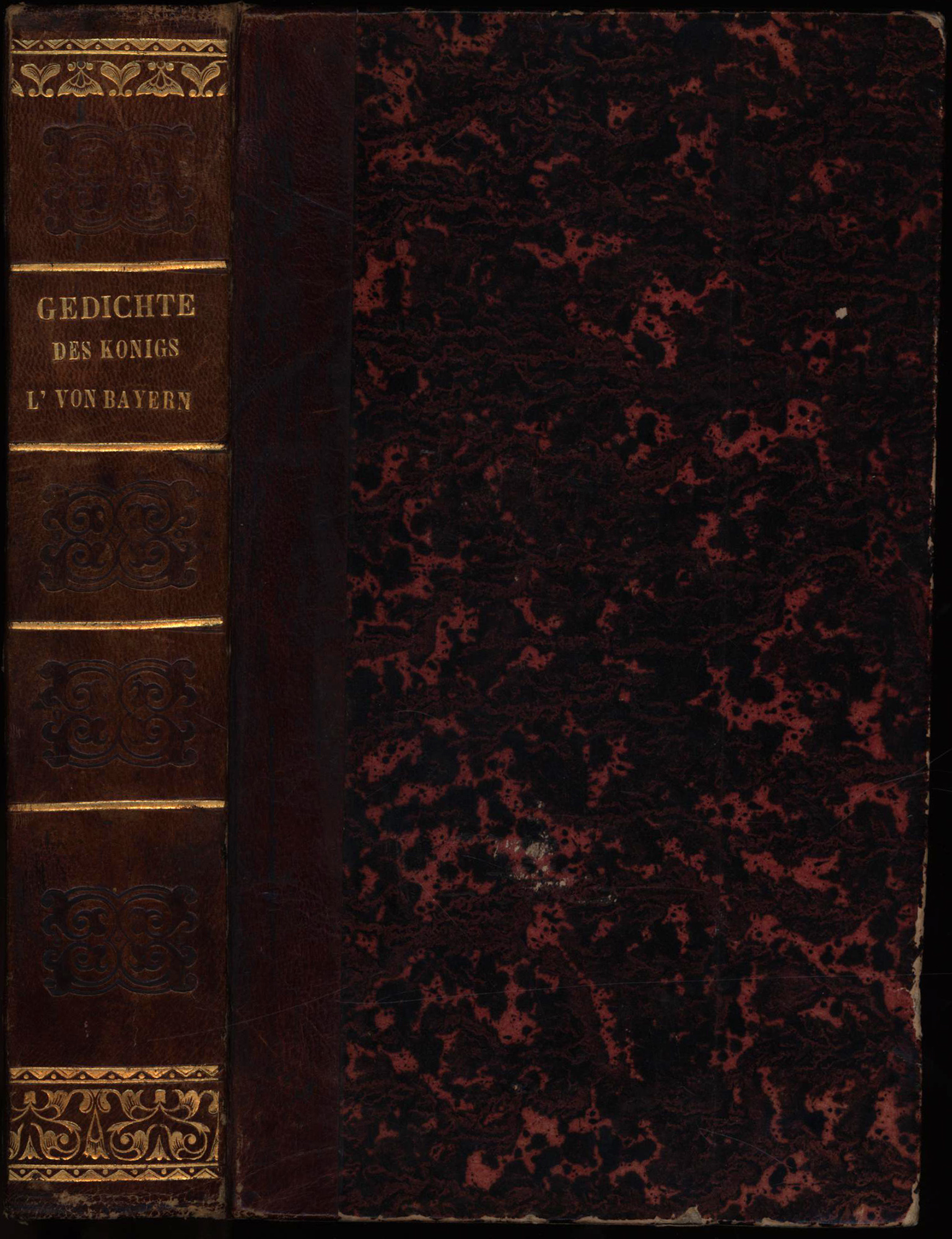 Ludwig: Gedichte Ludwigs des Ersten, Königs von Bayern. 2 Teile (in 1 Band, komplett). München, Cotta Verlag, 1829. 8°. 18,5 x 12 cm. XIV, 298; VII, 254 Seiten. Halblederband der Zeit mit blinder und goldener Rückenprägung, marmoriertem Deckelbezug und blauem Sprengschnitt.