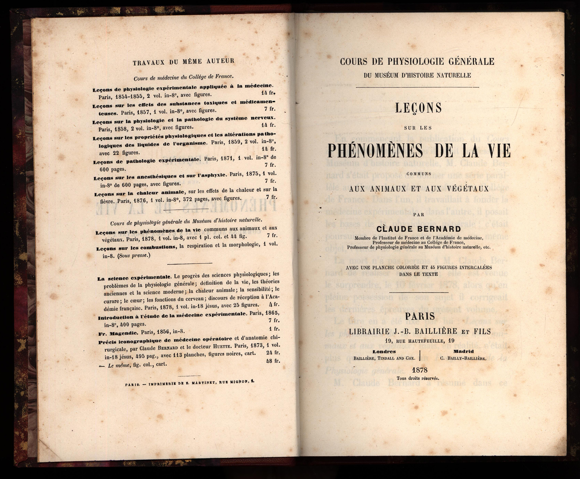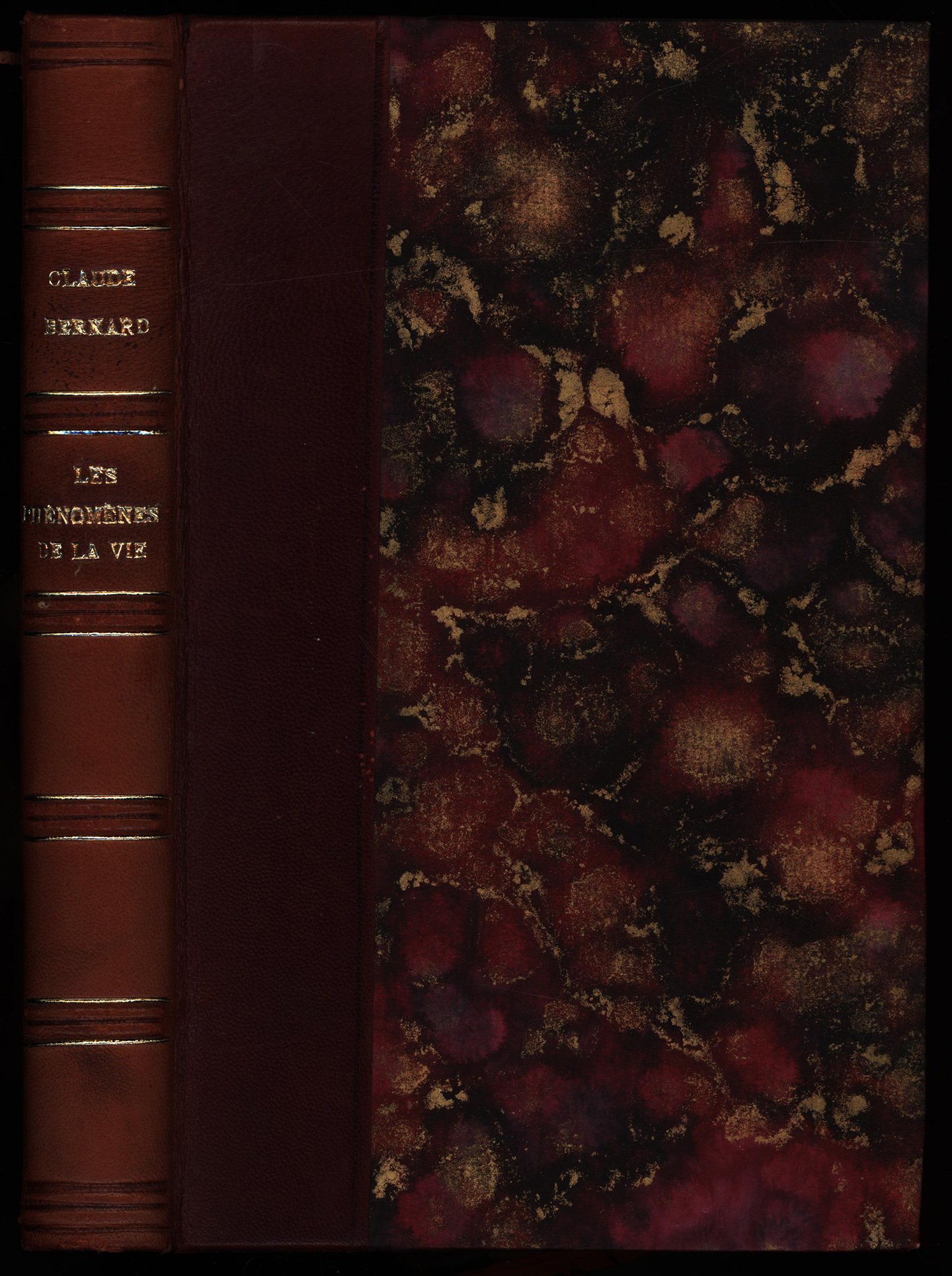 Bernard, Claude: Leçons sur les phénomènes de la vie communs aux animaux et aux végétaux. Paris, Verlag Baillière et Fils, 1878. Groß-8°. 23 x 15 cm. XXXII, 404 Seiten, [2] Blatt. Halblederband im Stile der Zeit auf 5 Bünden mit goldgeprägtem Rückentitel, gold- und blindgeprägten Rückenfileten, marmoriertem Deckelbezugs- und Vorsatzpapier und blauem Sprengschnitt. (= Cours de physiologie générale du Muséum d’Histoire Naturelle, Band 1).