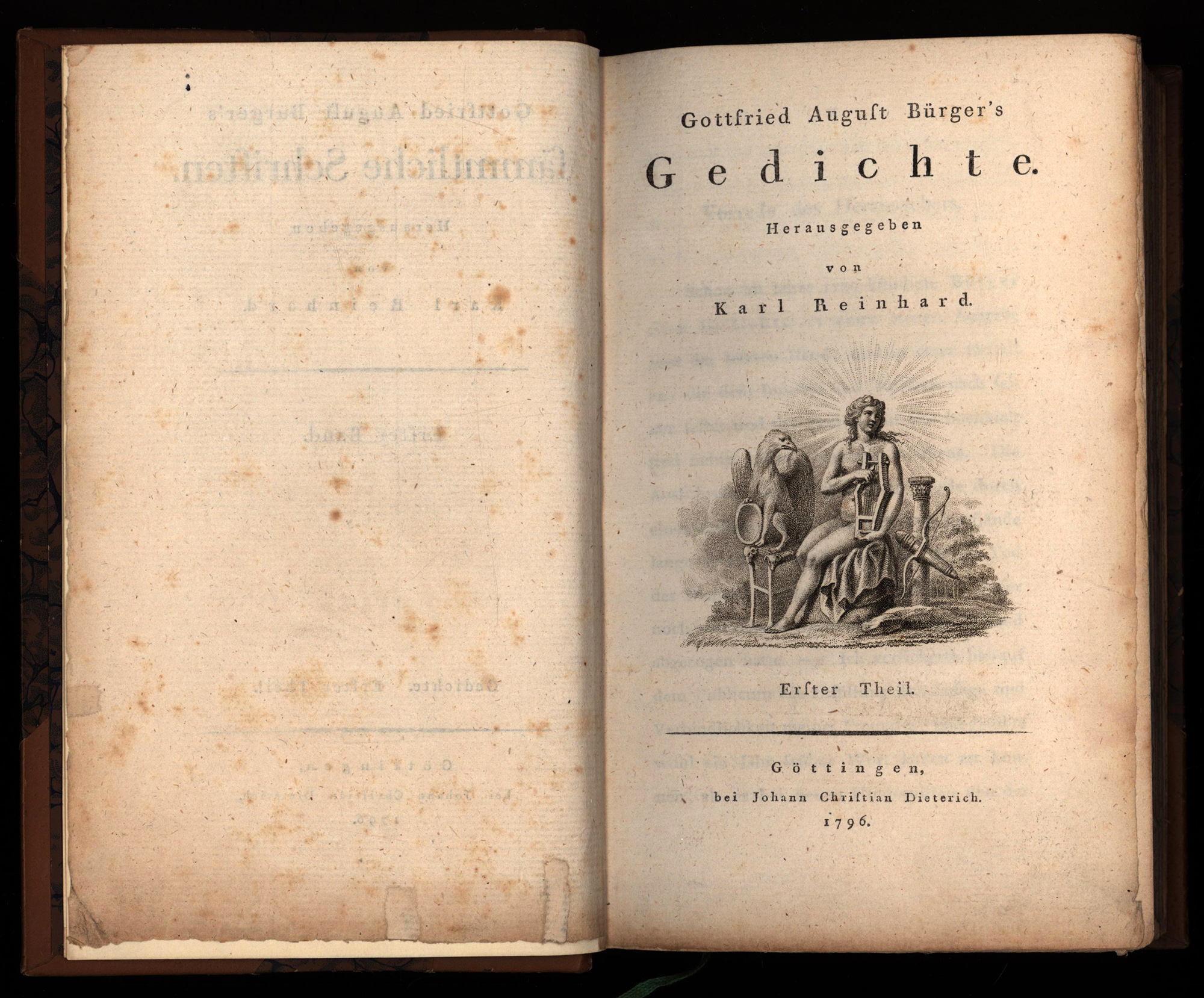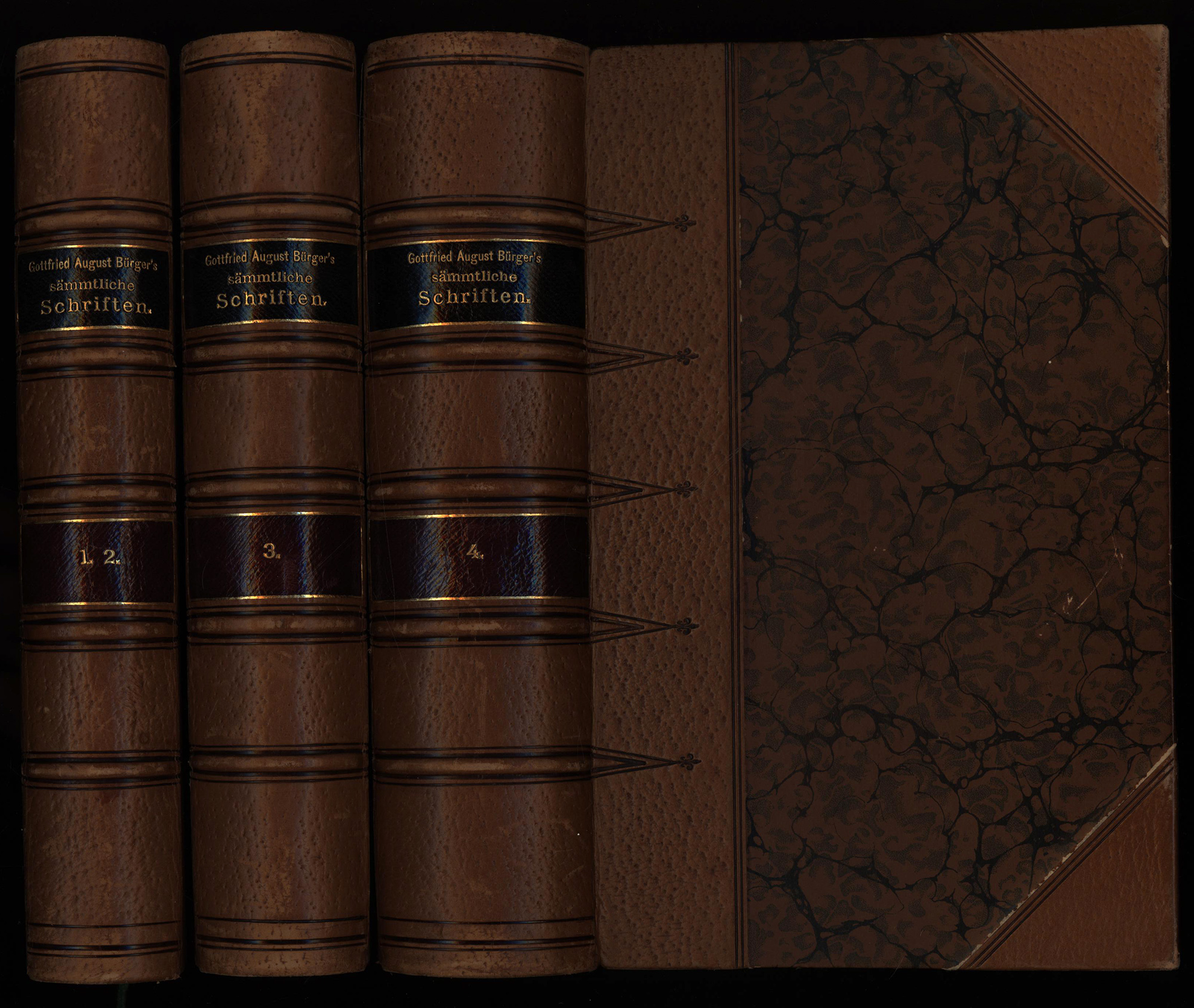 Bürger, Gottfried August: Sämmtliche Schriften. 4 Bände (in 3, komplett). [Erste Ausgabe]. Göttingen, Verlag Johann Christian Dieterich, 1796-1798. 8°. 22 x 14,5 cm. XX, 276, X, 296; 454; VII, 644 Seiten. Etwas spätere Halblederbände im Stile der Zeit auf 5 Bünden mit goldgeprägten Titeln auf schwarzen Lederrückenschildern und Kopfgoldschnitt und zweiseitig rauem Schnitt.