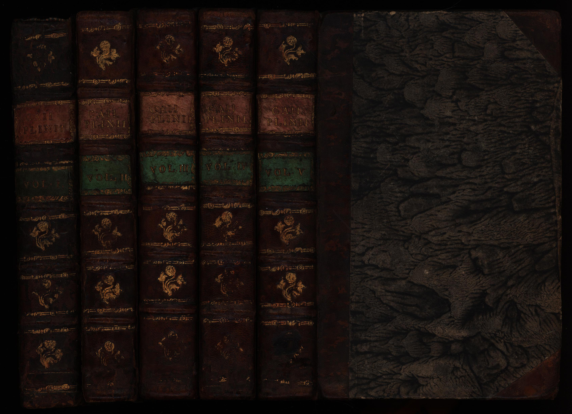 Plinius: Caii Plinii Secundi Historiae Naturalis Libri XXXVII. Praemittitur Notitia Literaria. Accedit Index Studiis Societatis Bipontinae. 5 Bände (komplett). Editio Accurata. Zweibrücken, Typographia Societatis, 1783-1784. 8°. 20 x 13 cm. XLVIII, 424 Seiten; [1] Blatt, [1] Blatt, 392 Seiten; 436 Seiten; [1] Blatt, 423 Seiten; [1] Blatt, 446 Seiten. Halblederbände der Zeit mit godlgeprägten Titeln auf Lederrückenschildern, floraler Rückenprägung in Gold, marmoriertem Deckelbzug, marmorierten Vorsätzen und Rundum-Rotschnitt.