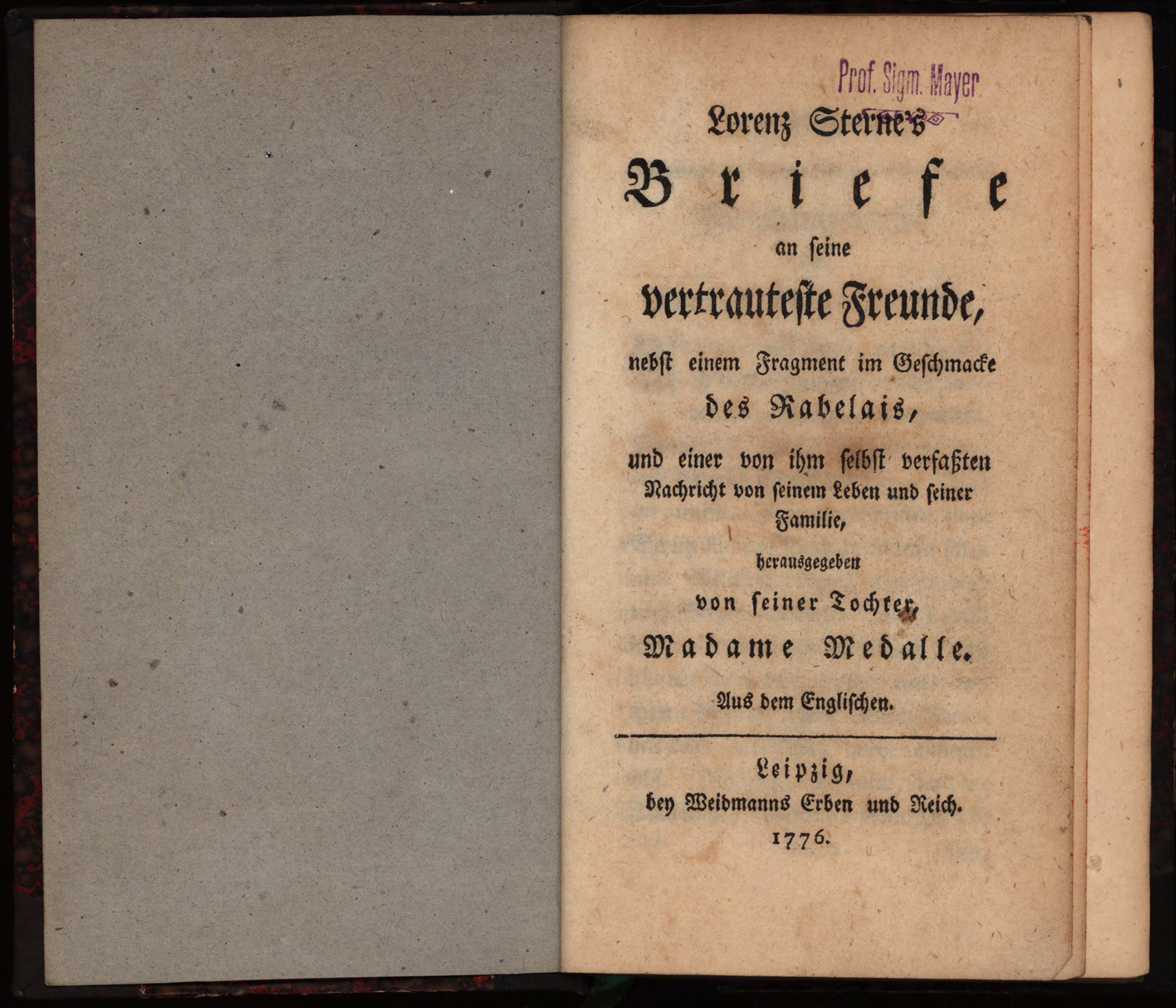 Sterne, Laurence: Lorenz Sterne’s Briefe an seine vertrauteste Freunde, nebst einem Fragment im Geschmacke des Rabelais, und einer von ihm selbst verfaßten Nachricht von seinem Leben und seiner Familie Aus dem Englischen. Leipzig, Verlag Weidmanns Erben und Reich, 1776. 8°. 16 x 10,5 cm. XXVIII Seiten, [1] Blatt, 391 Seiten. Halbleinenband der Zeit mit Papierrückenschild, marmoriertem Deckelbezug und rotem Sprengschnitt.