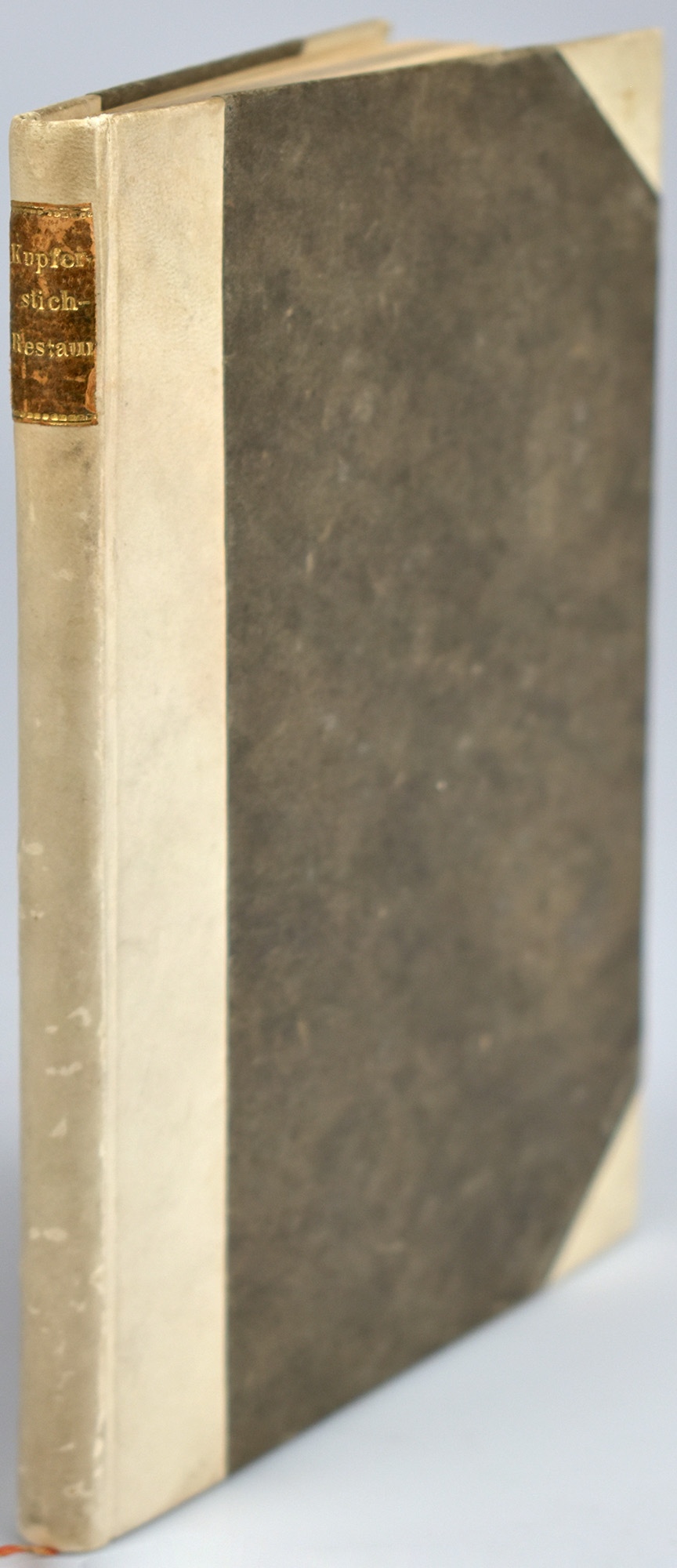 Bonnardot, Alfred: Die Kunst, Kupferstiche zu restauriren und Flecken aus Papier zu entfernen. Eine Anweisung, schadhafte und beschmutzte Kupferstiche, Zeichnungen, Aquarelle usw. von Flecken zu befreien, zu bleichen, zu entfärben, auszubessern und aufzubewahren, sowie Flecken aller Art aus Papier, Pergament, gedruckten Büchern, Papp- und Papierarbeiten usw. auf das Sauberste und unfehlbar zu entfernen ; ein Hülfsbuch für Kupferstich-Sammler, Bibliothekare, Zeichner, Maler, Buchbinder, Papparbeiter usw. Quedlinburg, Verlag von G. Basse, 1859. 8°. 19,5 x 13 cm. IV, 104 Seiten. Halbpergamentband der Zeit mit goldgeprägtem Titel auf ledernem Rückenschild.
