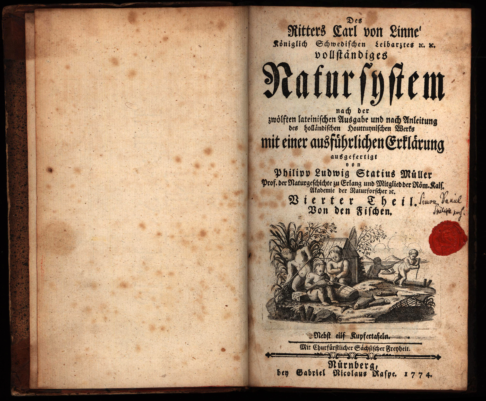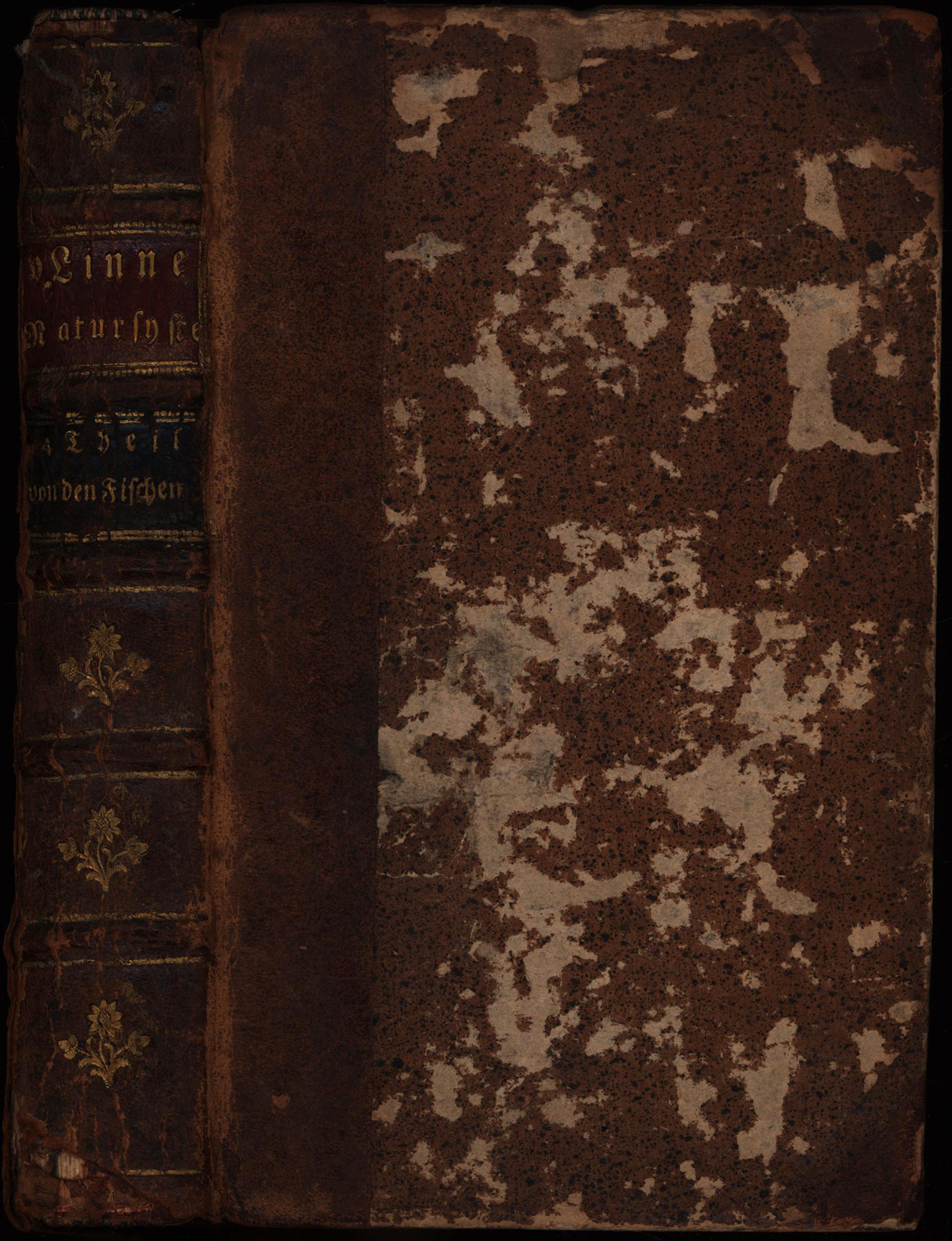 Linné, Carl von; Müller, Philip Ludwig Statius: Des Ritters Carl von Linné Königlich Schwedischen Leibarztes [et]c. [et]c. vollständiges Natursystem nach der zwölften lateinischen Ausgabe und nach Anleitung des holländischen Houttuynischen Werks mit einer ausführlichen Erklärung. Vierter Theil: Von den Fischen. Nebst eilf Kupfertafeln. Band 4 (von 6). Nürnberg, Verlag Gabriel Nicolaus Raspe, 1774. 8°. 20 x 12,5 cm. (16), 400, (16) Seiten. 11 Falttafeln. Halblederband der Zeit auf 5 Bünden mit floraler Rückenvergoldung, goldgeprägten Rückentiteln auf rotem und schwarzem Lederschild, goldgeprägten Rückenfileten, marmorierten Vorsätzen und Rundum-Rotschnitt.