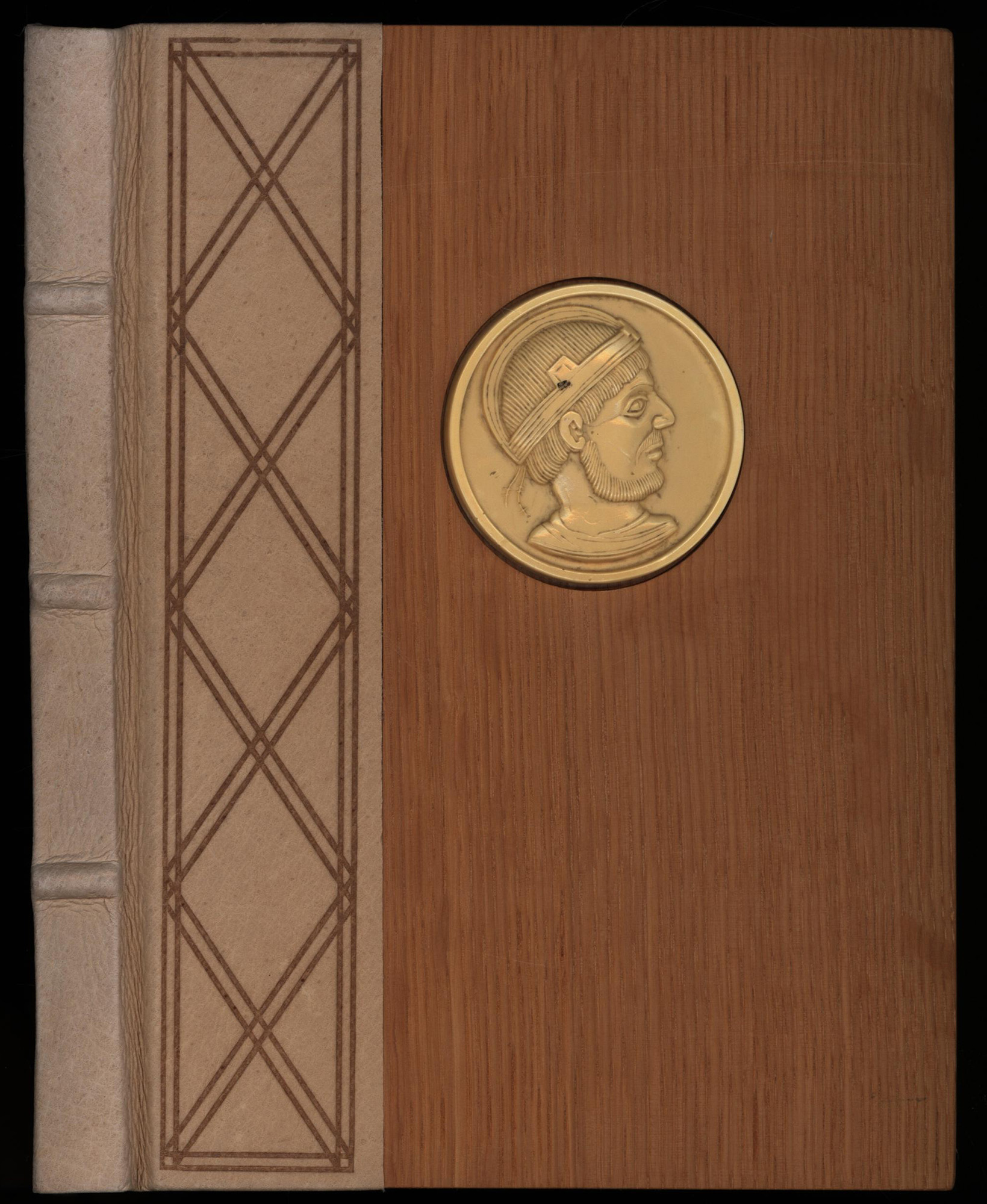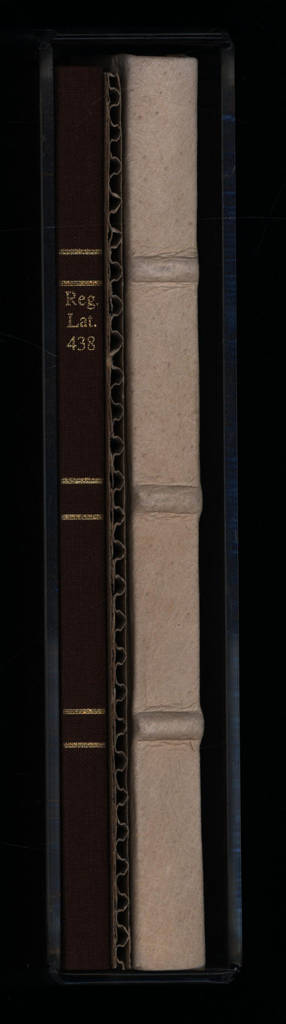 Original half-leather binding over wooden boards with blind tooling after fillet lines and a coin relief on the front cover, together with the original cloth volume with gilt spine title, housed in the original plexiglass slipcase. Complete facsimile edition of Codex Reginensis Latinus 438, with accompanying certificate. Number 567 of 900 numbered copies. Bilingual edition (facsimile in Latin, commentary in German). With 12 full-page, gold-heightened colour miniatures, one approx. 21-line gold-heightened miniature, and numerous gold initials. The binding is modelled after that of the Lothar Psalter held by the British Museum (Add. 37 768). Mint copy.