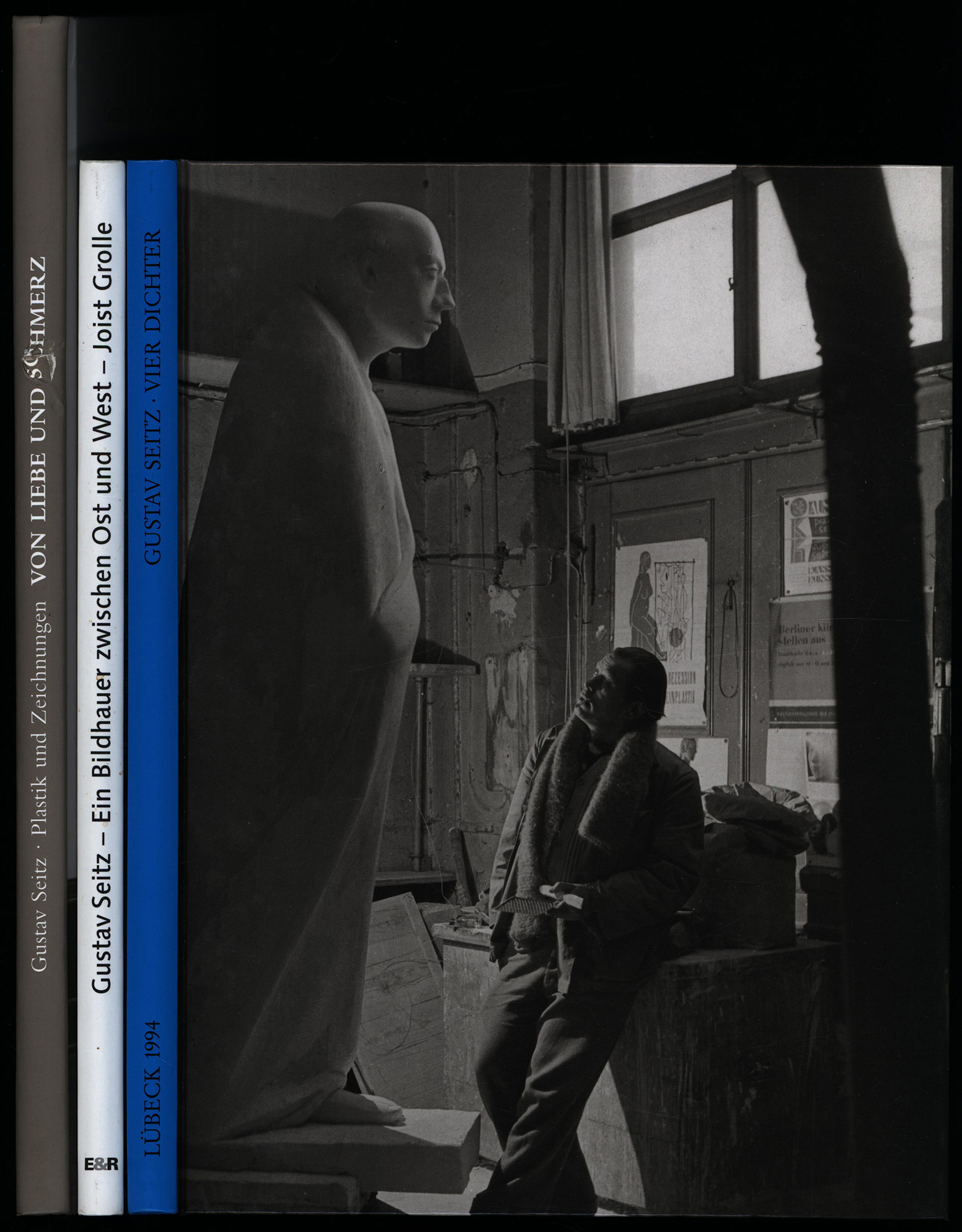 Seitz, Gustav: Konvolut von 3 Bänden Gustav Seitz. Buch 1: Gustav Seitz, vier Dichter. François Villon, Heinrich Mann, Bertolt Brecht, Thomas Mann; Plastik, Zeichnung, Druckgraphik. Herausgegeben von Gerhard Gerkens. Buch 2: Von Liebe und Schmerz. Plastik und Zeichnungen. Buch 3: Grolle, Joist: Gustav Seitz. Ein Bildhauer zwischen Ost und West. 3 Bände. Lübeck und Hamburg, Museum für Kunst und Kulturgeschichte, Steintor-Verlag und Ellert & Richter Verlag, 1994 – 2010. 4°. 33,5 x 25 cm. [142], 104, 104 Seiten. Gebundene Original-Pappbände.