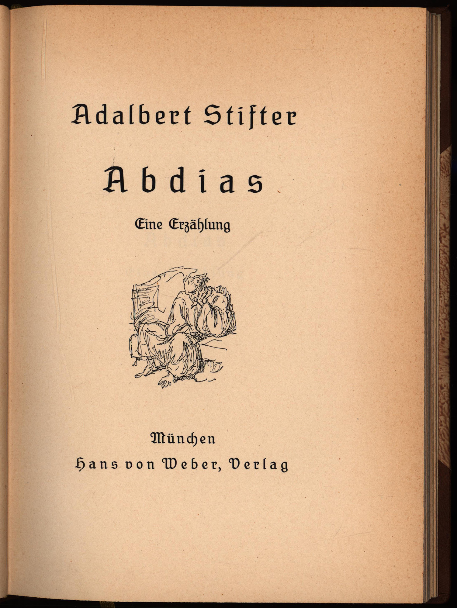 Stifter, Adalbert: Abdias. Eine Erzählung. München, Verlag Hans von Weber, 1923. 4°. 25,5 x 18 cm. 125 Seiten. Handeinband in Halbleder auf 5 Zierbünden mit goldgeprägtem Rückentitel, Deckelfileten und Kopfgoldschnitt. (= Dreiangeldrucke, Band 18).