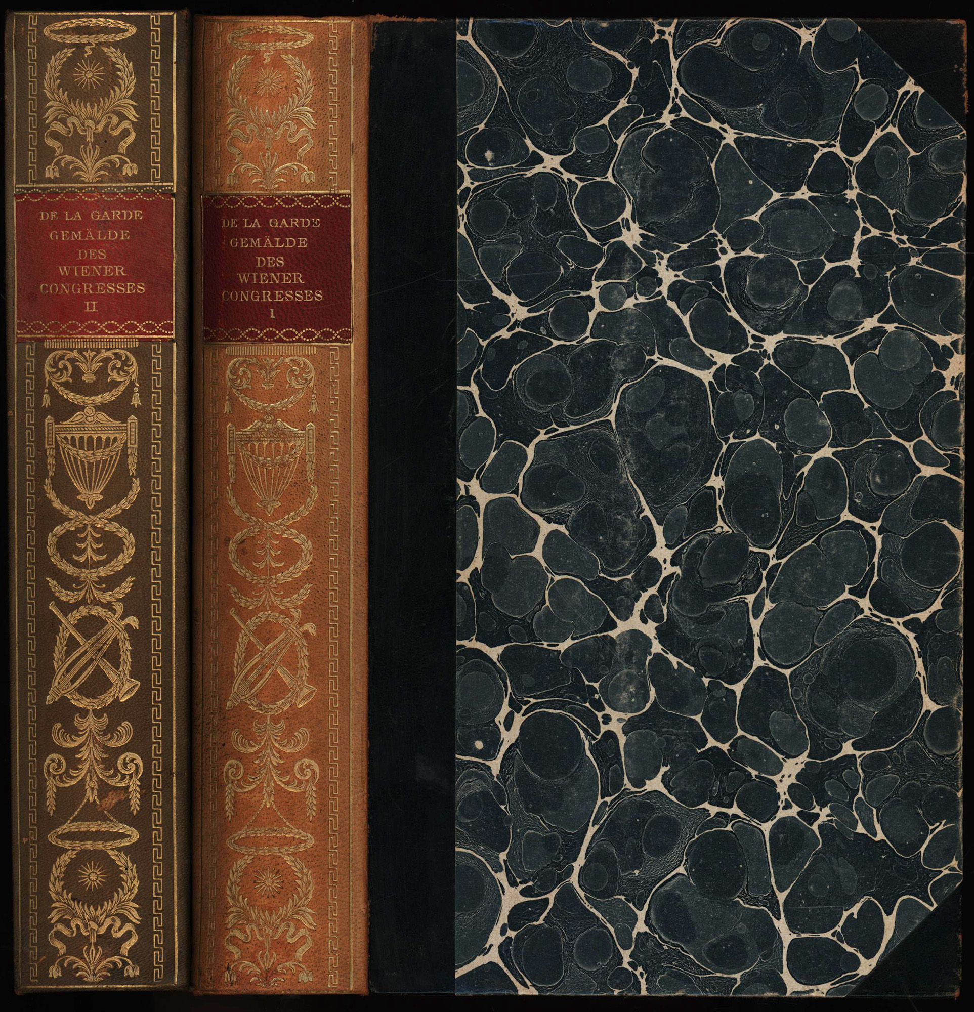 La Garde, Auguste de: Gemälde des Wiener Kongresses 1814 – 1815. Erinnerungen, Feste, Sittenschilderungen, Anekdoten. Erster [und] zweiter Band. 2 Bände (komplett). München, Verlag Georg Müller, 1914 8°. 21 x 14 cm. LIV, 463; 486 Seiten. Halblederbände der Zeit mit ornamentaler Goldprägung auf dem Rücken, goldgeprägten Rückentiteln auf roten Lederschildchen, marmoriertem Deckelbezug und Rundum-Gelbschnitt. (= Denkwürdigkeiten aus Altösterreich, Band 1 und 2).