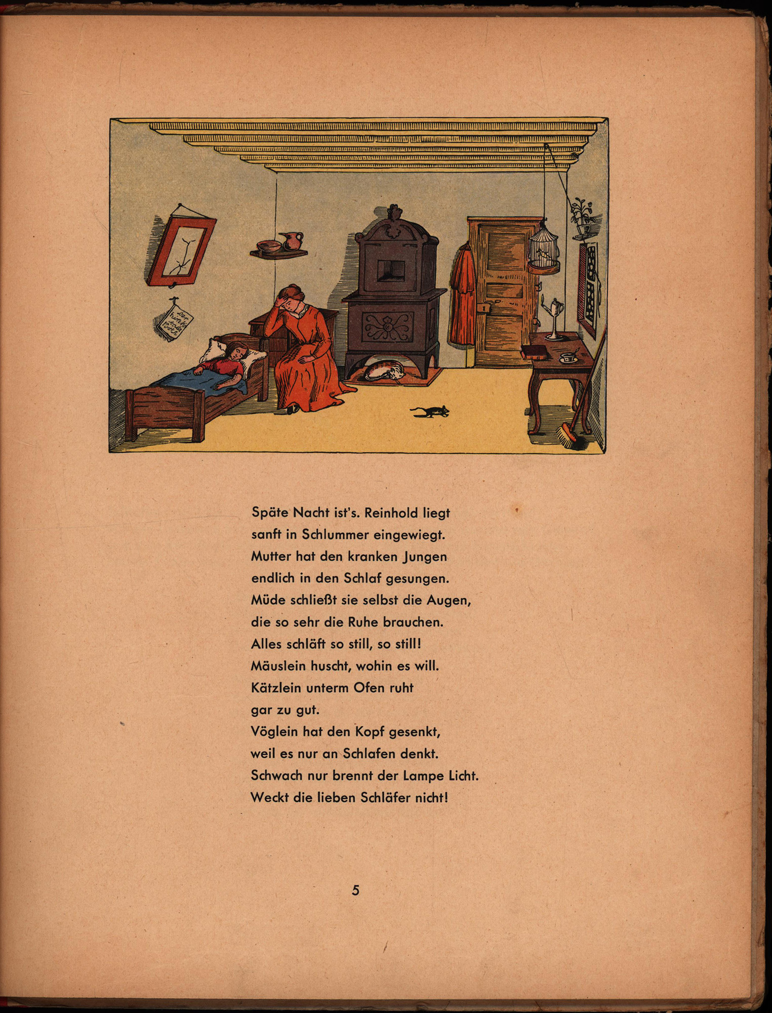 68. Auflage, 451.-460. Tausend. Jedes Blatt mit Abbildung in Farbe, überwiegend halbseitig, ansonsten umfassender. Die Blätter 6, 7 und 25-27 jeweils mit größerem Randeinriss zwischen 8 und 23 cm (der letztgenannte mit Abstand der größte und mit Bildberührung, die übrigen mit Textberührung, aber ohne Verlust), mehrere Seite zudem mit kleinerem Randeinriss (ohne Bild- oder Textberührung). Einband etwas berieben und bestoßen, gebräunt und fleckig. Insgesamt noch gutes Exemplar mit Abbildungen in leuchtenden Farben.