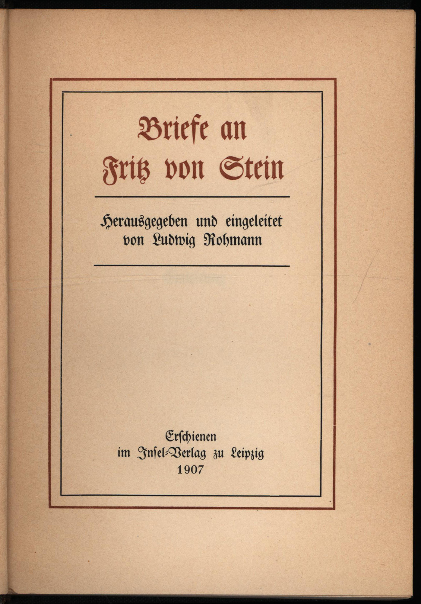 Rohmann, Ludwig (Hrsg.): Briefe an Fritz von Stein. Herausgegeben und eingeleitet von Ludwig Rohmann. Leipzig, Insel-Verlag, 1907. 8°. 19,5 x 14,5 cm. XII, 306 Seiten. Illustrierter Original-Leinenband mit goldgeprägtem Rückentitel. Kopfgoldschnitt.