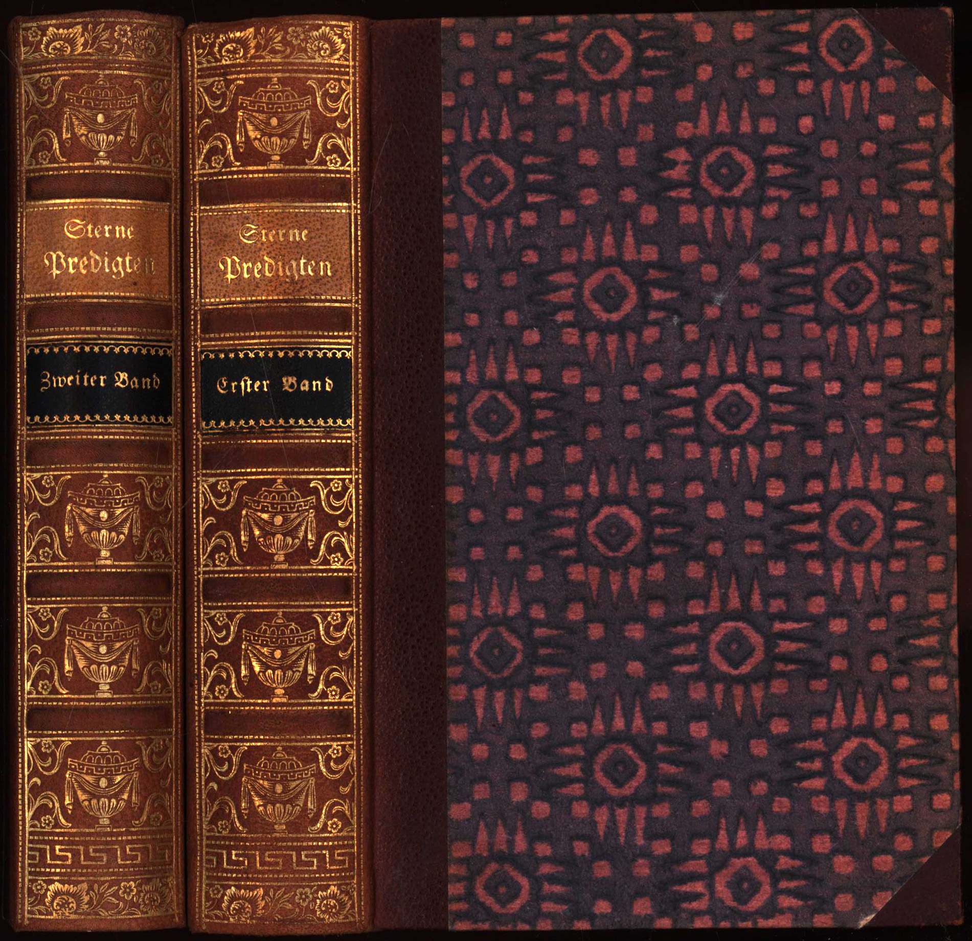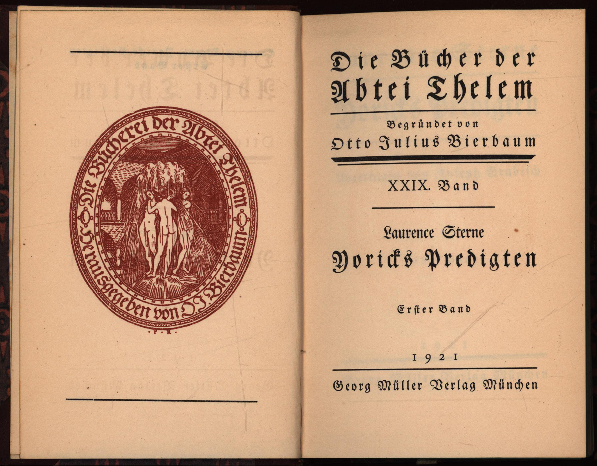 Sterne, Laurence: Yoricks Predigten. 2 Bände (komplett). München, Verlag Georg Müller, 1921. Klein-8°. 15,5 x 10,5 cm. XXII, 502; 508 Seiten. Original-Halblederbände mit reicher Rückenvergoldung, goldgeprägten Rückentiteln auf Lederschildchen, Deckelbezug aus Buntpapier und Rundum-Grünschnitt. (= Die Bücher der Abtei Thelem, Band 29 und 30).