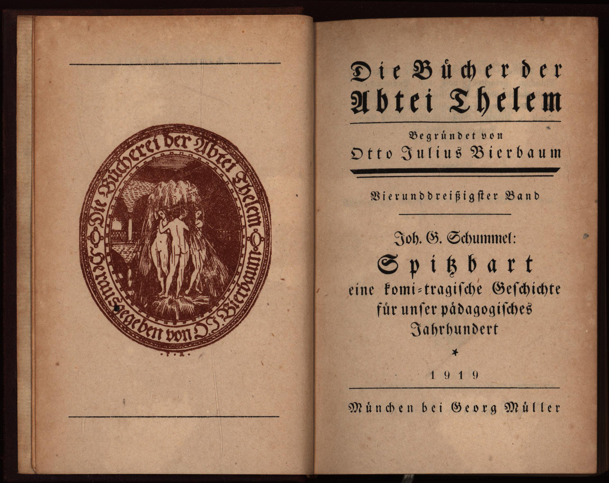 Schummel, Johann Gottlieb: Spitzbart, eine komi-tragische Geschichte. Mit einem Vorwort und Anmerkungen von C.G. Maassen. [Vorzugsausgabe in Ganzleder]. München, Verlag Georg Müller, 1920. Klein-8°. 15,5 x 11 cm. XLII, 484 Seiten. Original-Halblederband mit goldgeprägtem Rückentitel und grünem Farbschnitt. (= Die Bücher der Abtei Thelem. Begründet von Otto Julius Bierbaum, Band 34).