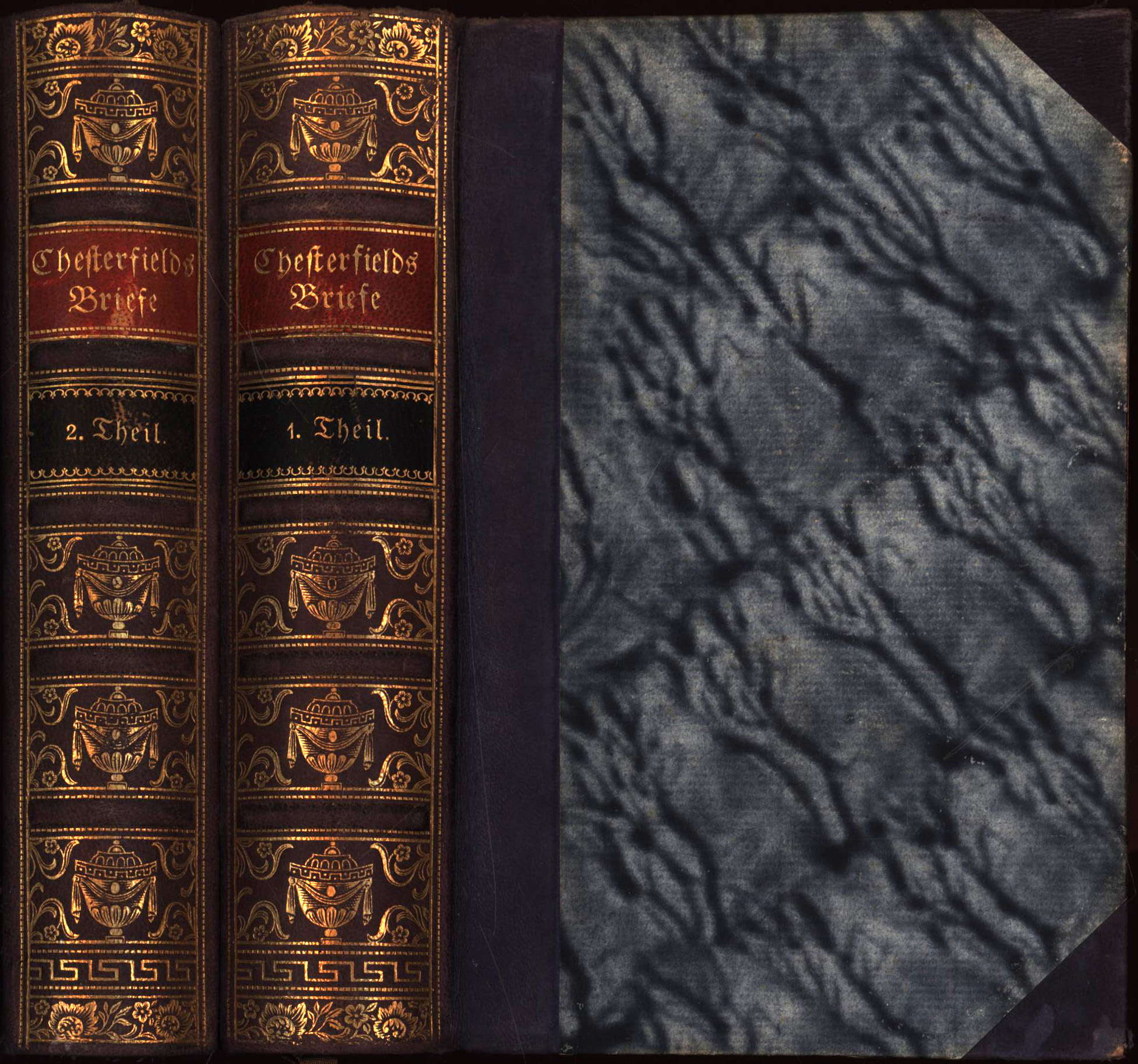 Feigl, Hans (Hrsg.): Lord Chesterfields Briefe an seinen Sohn. Auf Grund der ersten deutschen, hier verbesserten Ausgabe in Auswahl herausgegeben und eingeleitet von Hans Feigl. Mit dem der ersten englischen Ausgabe beigegebenen Porträt Chesterfields. 2 Bände (komplett). München/Leipzig, Georg Müller Verlag, 1912. Klein-8°. 15,5 x 11 cm. XXXIX, 375; 378 Seiten. Original-Halblederbände mit goldgeprägtem Rückentitel. (= Die Bücher der Abtei Thelem. Begründet von Otto Julius Bierbaum. Band 8 und 9).