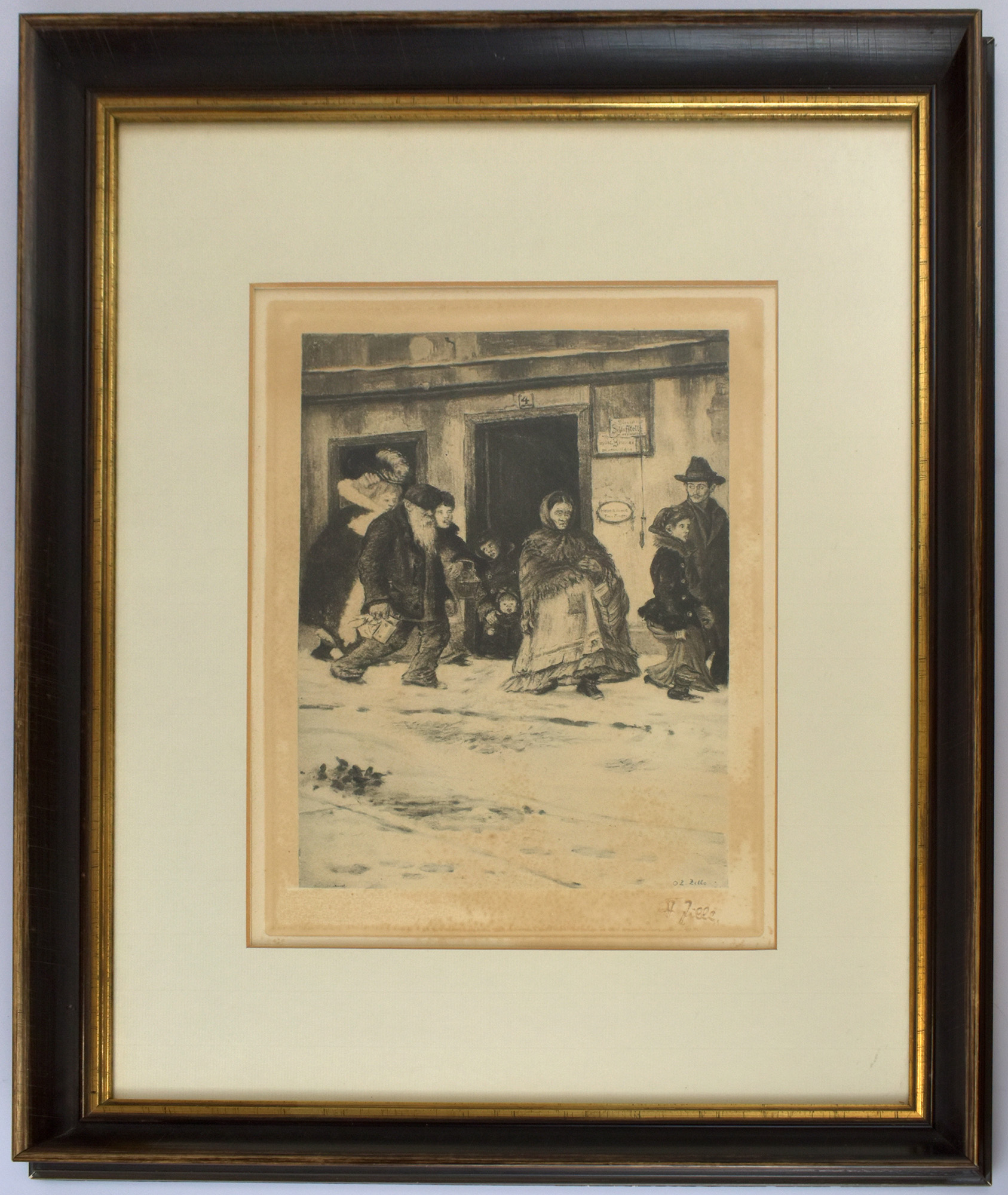 Original-Heliogravüre und Roulette auf Büttenpapier. Blatt 9 des Mappenwerkes „Zwölf Künstlerdrucke“ von 1909 nach einer farbigen Zeichnung von 1902. In der Platte links unten bezeichnet „Rinnsteinkunst“ und unten rechts mit „02. Zille“ und unterhalb der Abbildung unten rechts mit Stempelsignatur von Heinrich Zille (Stempel 3). Rosenbach 28 d. Nicht ausgerahmt. Maße Platte: 31,0 x 23,3 cm. Maße Abbildung: 27,0 x 20,0 cm. Maße Rahmen: 55,0 x 45,0 cm. Blatt wenig braunfleckig. Sehr gutes Exemplar.