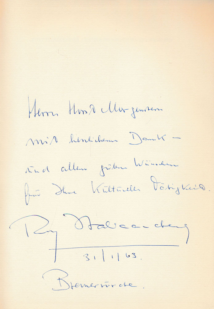 Nummer 29 von 99 Exemplaren der Sonderausgabe mit einem Bildnis des Autors und von ihm signiert. Zusätzlich mit 4-zeiliger signierter und datierter Widmung von Rolf Italiaander für den Buchhändler Horst Morgenstern auf Vorsatz. Schutzumschlag mit leichten Randläsuren, wenigen winzigen Flecken. Sehr gutes Exemplar.