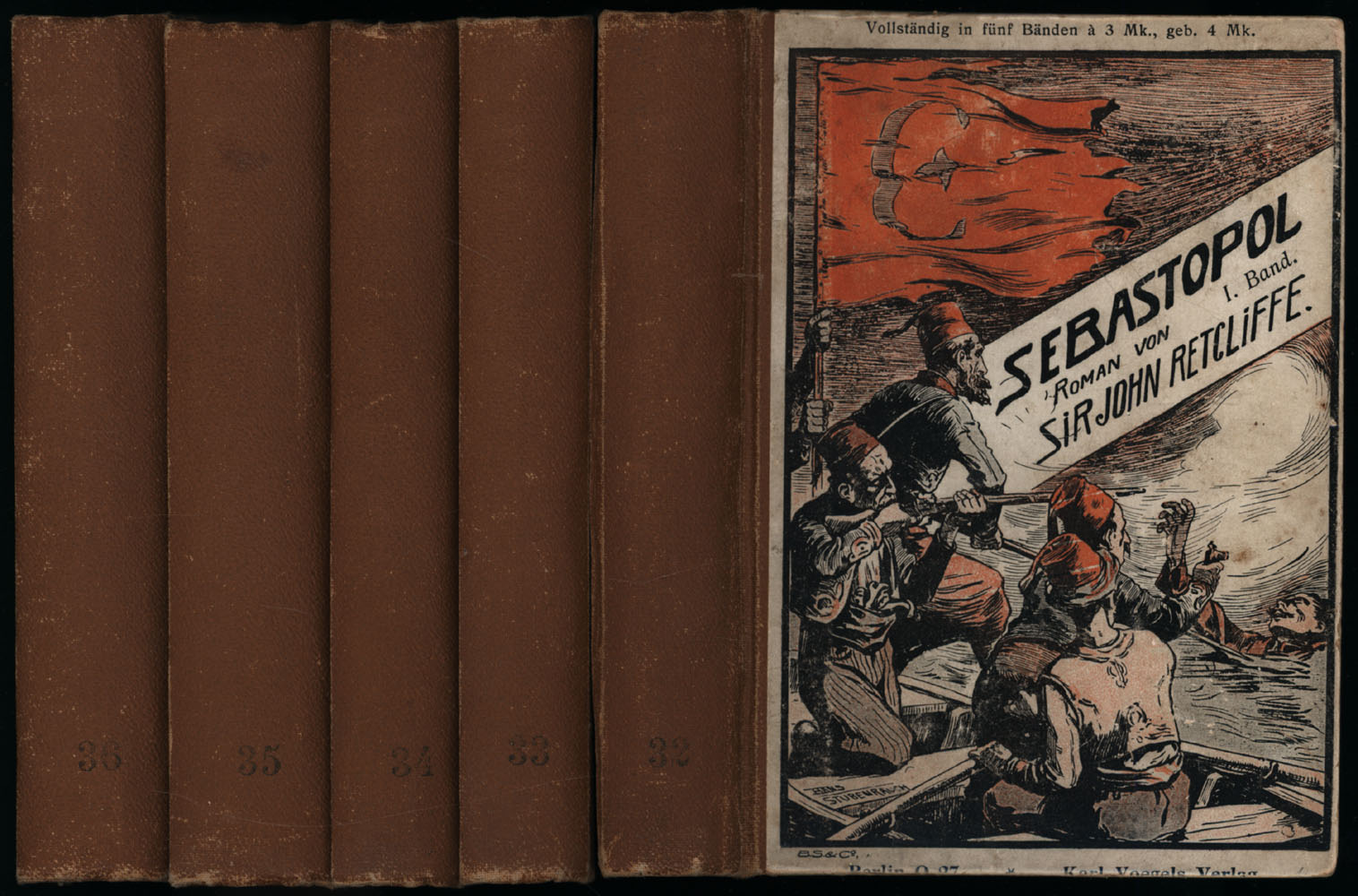 Retcliffe, John (= Hermann Goedsche): Sebastopol. 5 Bände (komplett). Berlin, Karl Voegels Verlag, o. J. [c. 1900]. Klein-8°. 18 cm. 417, 390, 386, 497, 445, Seiten. Original-Halblederbände. (= Sir John Retcliffe’s Historische Romane. Band 32-36).