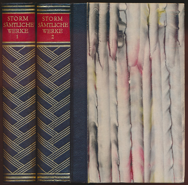 Storm, Theodor – Düsel, Friedrich [Hrsg.]: Sämtliche Werke in zwei Bänden. 2 Bände (komplett). Mit einer Einleitung von Paul Fechter. Berlin, Verlag von Th. Knaur Nachf., o.J. 8°. 19 cm. 907, 910 Seiten. Halblederbände mit goldgeprägten Rückentiteln, mehrfarbigem Bezugspapier und Kopfgoldschnitten.