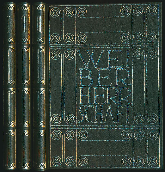 Robinson, Julian: Weiberherrschaft. 3 Bände (komplett). Die Geschichte der körperlichen und der seelischen Erlebnisse des Julian Robinson, nachmaligem Viscount Ladywood. Von ihm aufgezeichnet zu einer Zeit wo er unter dem Pantoffel stand. Erste und vollständige Übertragung aus dem Englischen von Erich Berini-Bell. Ohne Verlagsangabe, [1968]. 8°. 21 cm. VIII, 162, 160, 152 Seiten. Grüne Original-Pappbände. Mit ornamental goldgeprägten Deckel- und Rückentiteln.