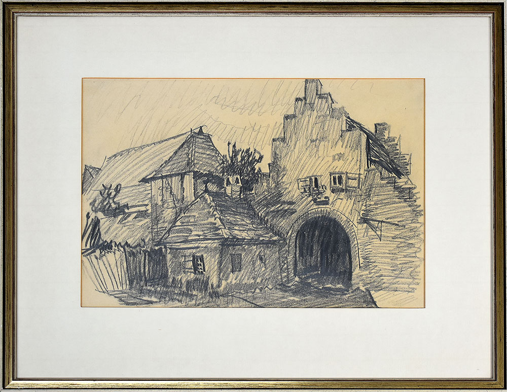 Engels, Robert: Frickenhausen. [Signierte Original-Bleistiftzeichnung, gerahmt / signed original pencil drawing, framed]. Robert Engels, geboren am 9. März 1866 in Solingen, gestorben am 24. Mai 1926 in München. Maler, Grafiker und Hochschullehrer. 1886–1889 Studium der Malerei an der Kunstakademie Düsseldorf bei Hugo Crola, Johann Peter Theodor Janssen, Heinrich Lauenstein und Adolf Schill. Mitarbeiter der Zeitschrift Jugend und Mitglied des Deutschen Werkbundes
